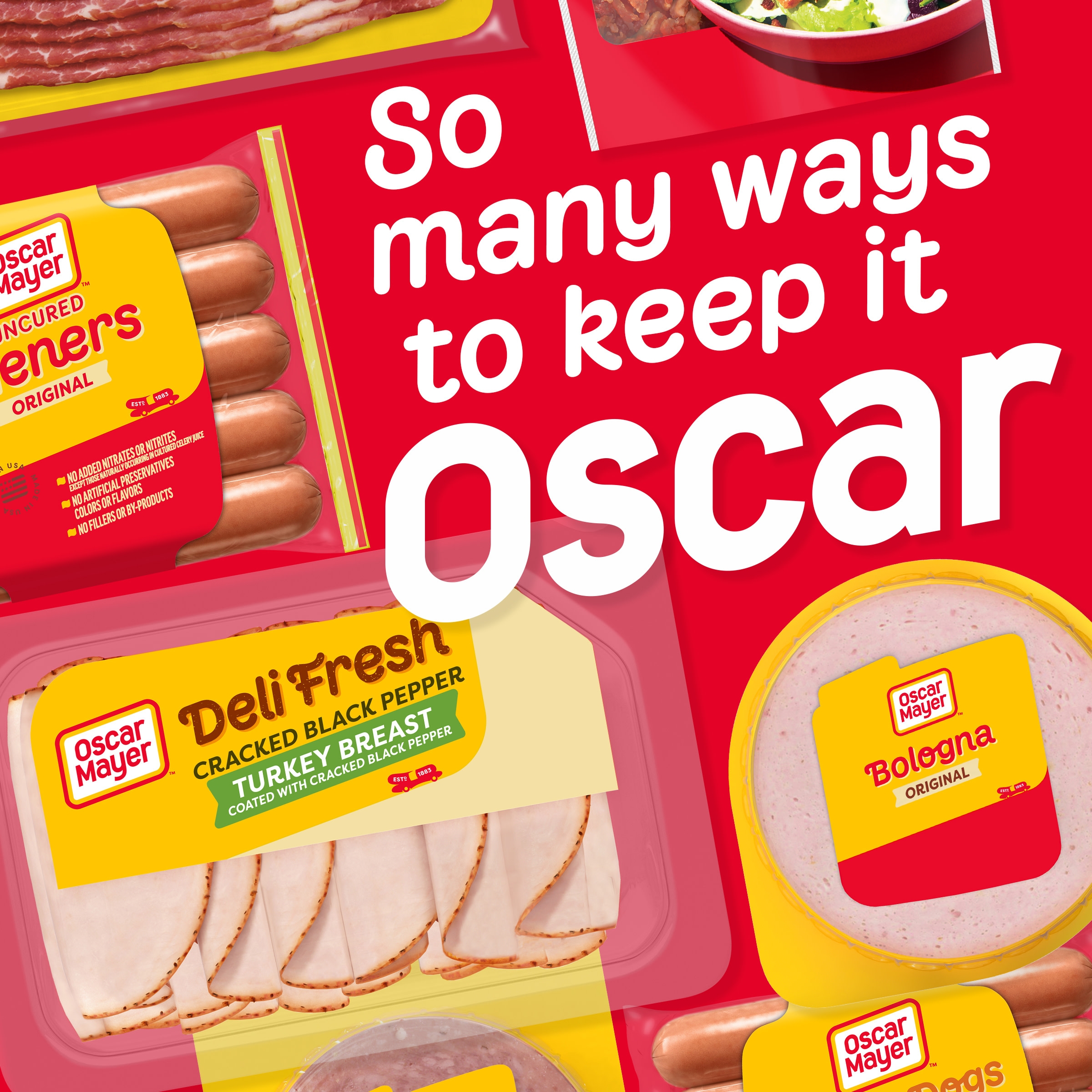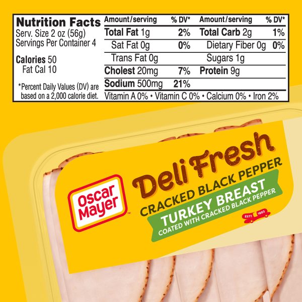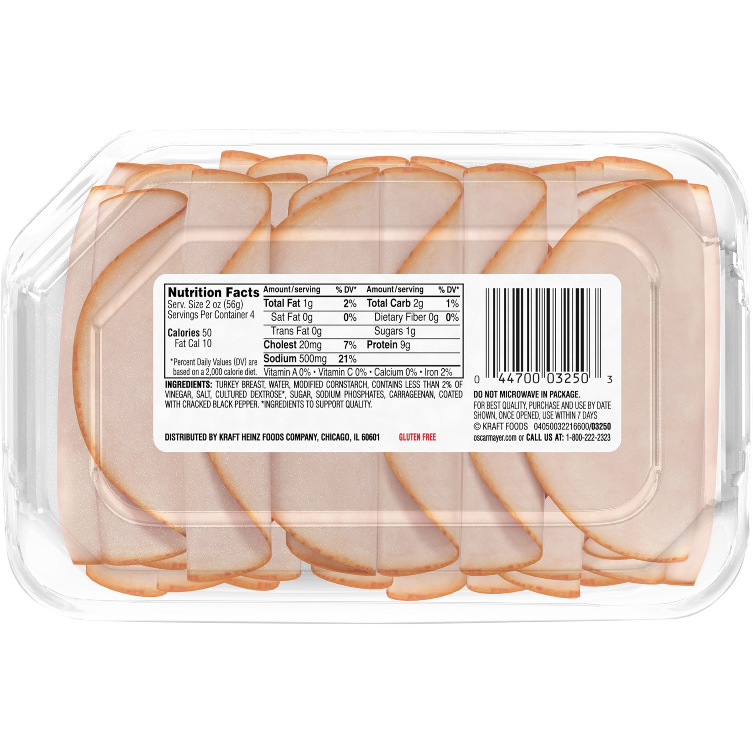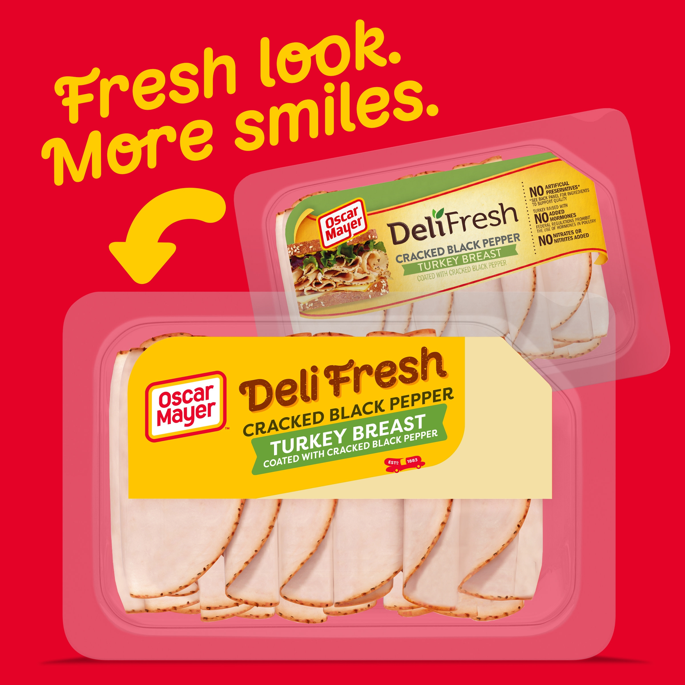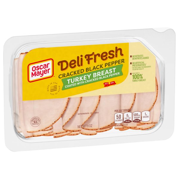 Oscar Mayer Deli Fresh Cracked Black Pepper Turkey Breast is quality deli fresh turkey meat with no artificial preservatives, no added hormones and no nitrates or nitrites added. This lunch meat is fully cooked and coated with crack blacked pepper for a mouthwatering flavor. Oscar Mayer Deli Fresh makes the perfect lunch – use Oscar Mayer Deli Fresh Cracked Black Pepper Turkey Breast to make a turkey club, a croissant sandwich, a turkey oven melt, or sandwich party trays! These deli cold cuts are also perfect for amini sandwich platter. Oscar Mayer Deli Fresh Cracked Black Pepper Turkey also makes a great addition to cheese and crackers, salads or on a meat tray with chicken breast and deli-sliced corn beef. Keep this 8 ounce tray refrigerated to maintain freshness.