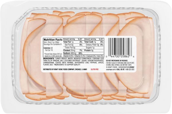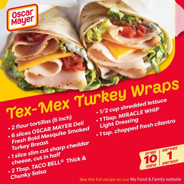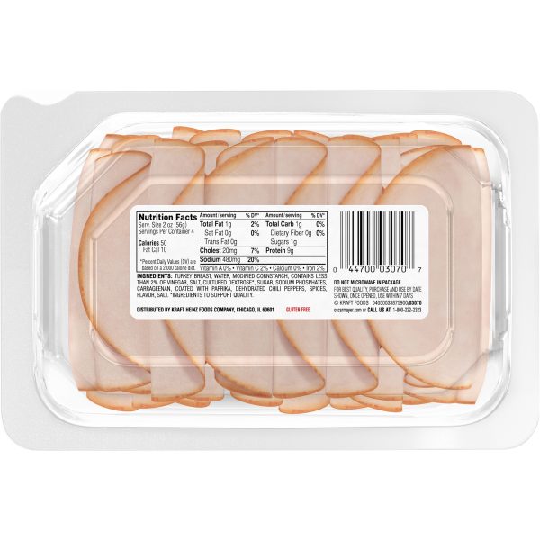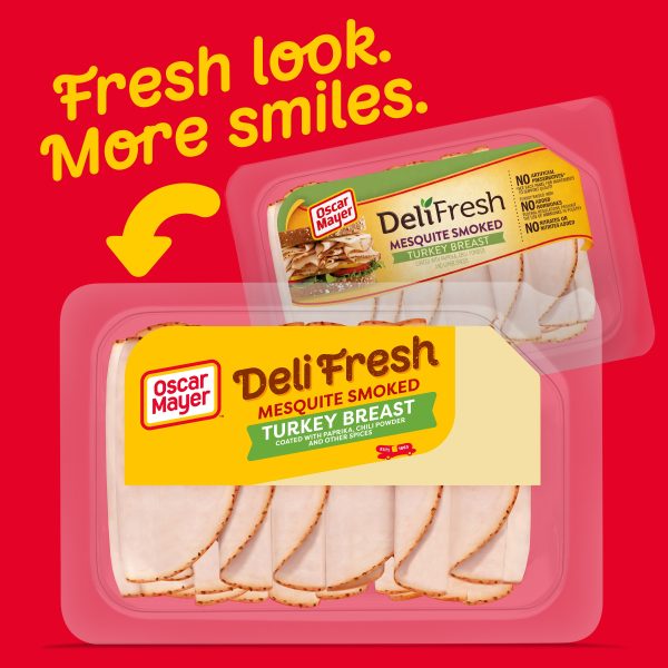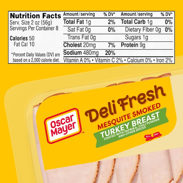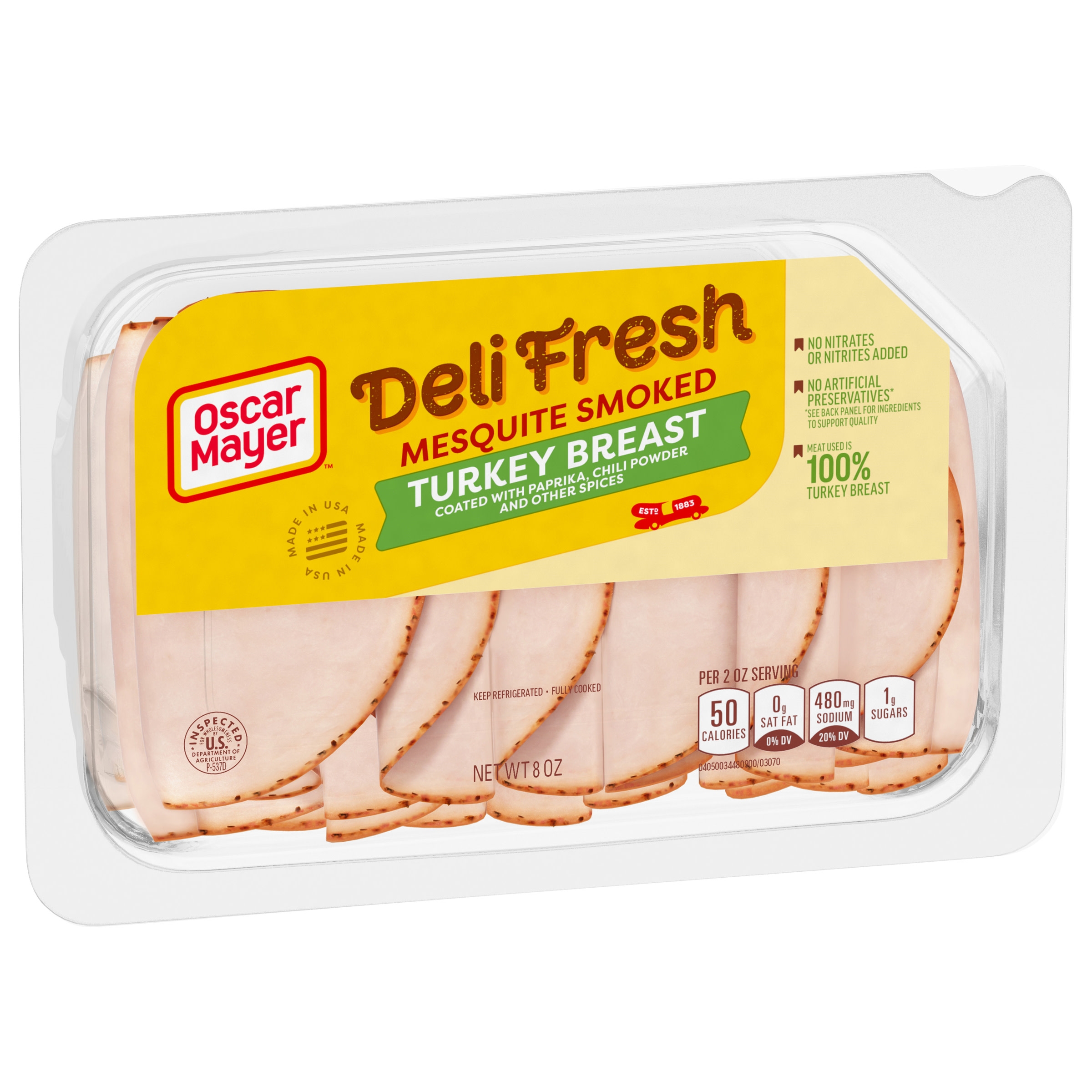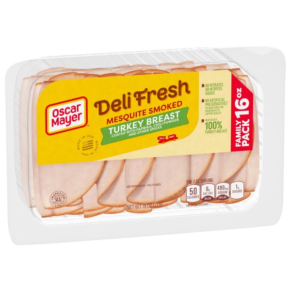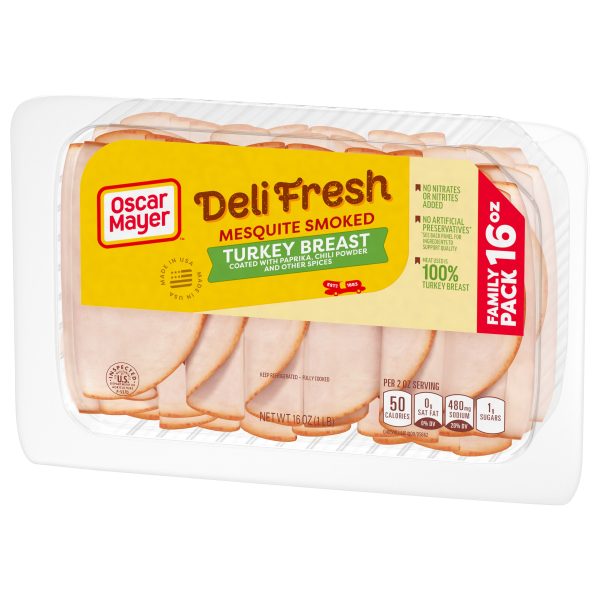Make a delicious deli sandwich at home with Oscar Mayer Deli Fresh Mesquite Smoked Turkey Breast Coated With Paprika, Chili Powder And Other Spices Sliced Lunch Meat. Our quality turkey deli meat is 98% fat-free and made with no artificial preservatives (see back panel for ingredients to support quality), no added hormones (federal regulations prohibit the use of hormones in poultry), and no added nitrates or nitrites. Fully cooked and ready to eat, our turkey slices are coated with paprika, chili powder and other seasonings for a mouthwatering smoky flavor that’s perfect for a classic turkey sandwich, salad, or cheese and crackers. Keep our family sized 16-ounce package of deli turkey refrigerated to maintain freshness. If you enjoy our mesquite smoked deli turkey, be sure to try the other varieties of Oscar Mayer turkey lunch meat.