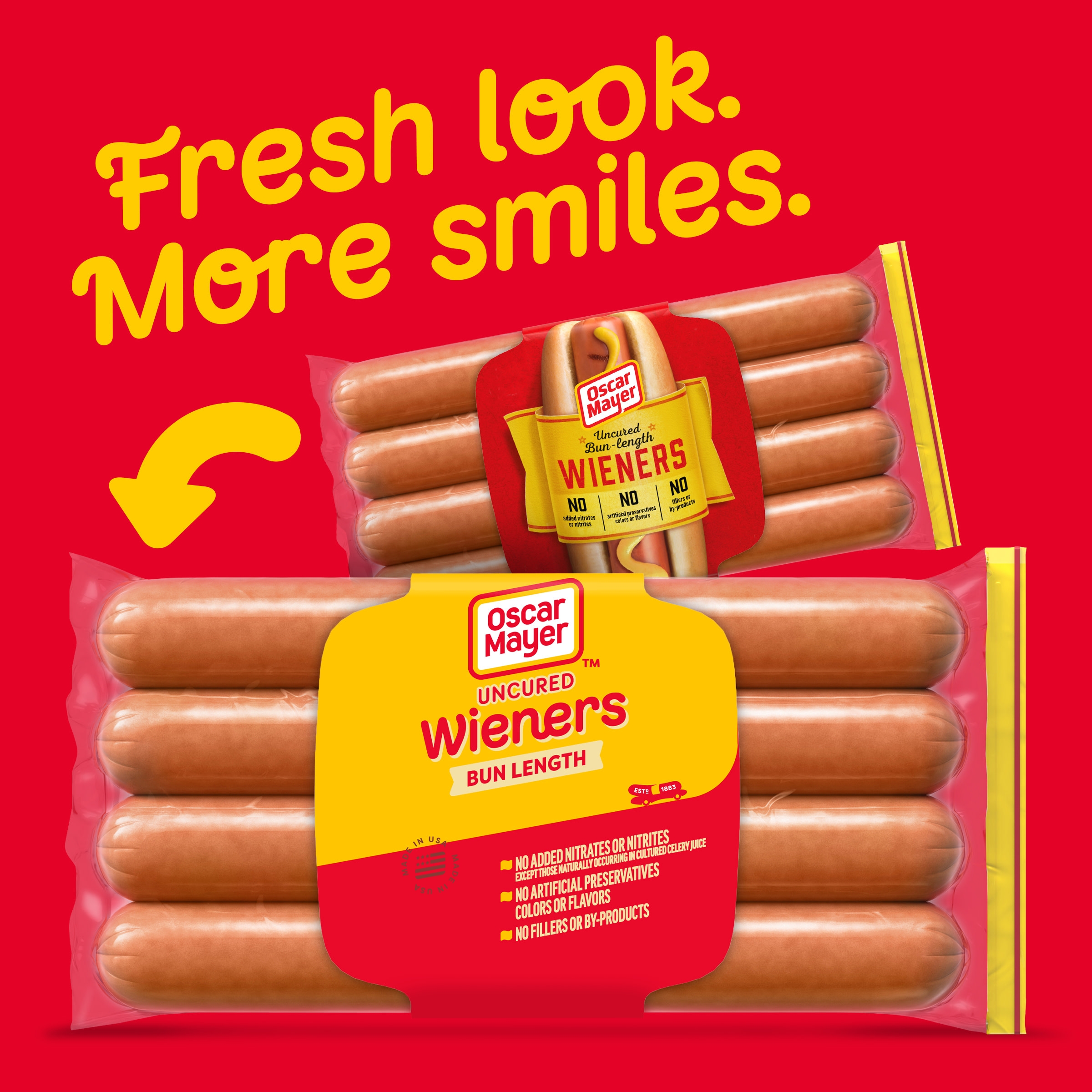 Oscar Mayer Uncured Bun Length Wieners deliver a classic hot dog flavor with a length that fits hot dog buns perfectly, so you get savory meat in every bite. Enjoy an uncured hot dog made from a combination of turkey, chicken and pork that has no fillers or by-products to ensure a quality product. Our hot dogs have 140 calories per serving, have no artificial preservatives, and no added nitrates or nitrites, except for those naturally occurring in cultured celery juice, for a great meat taste. Top these bun length hot dogs with ketchup and mustard for a traditional favorite, or cover them with chili sauce, cheese or other toppings to make a heartier snack. Each resealable plastic package comes with eight hot dogs and ensures they stay fresh until your next summer barbecue or family dinner. Oscar Mayer Uncured Bun Length Wieners are a great part of any summer spread for Memorial Day or Fourth of July BBQs.