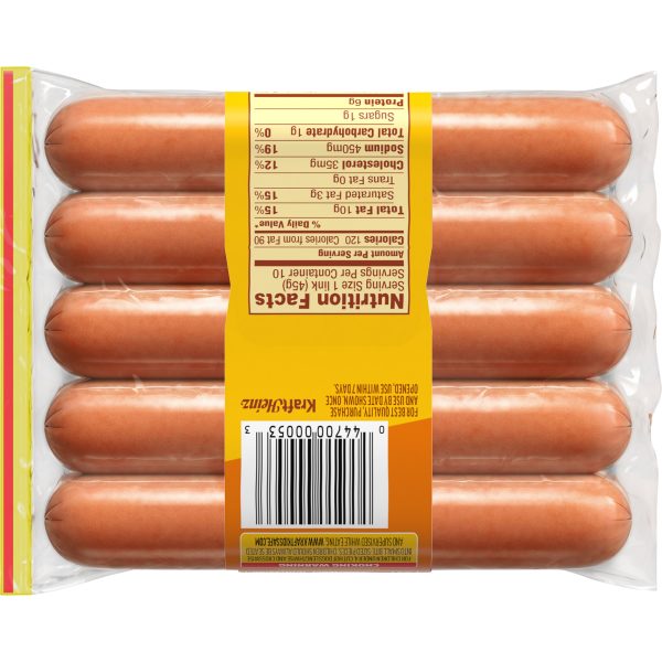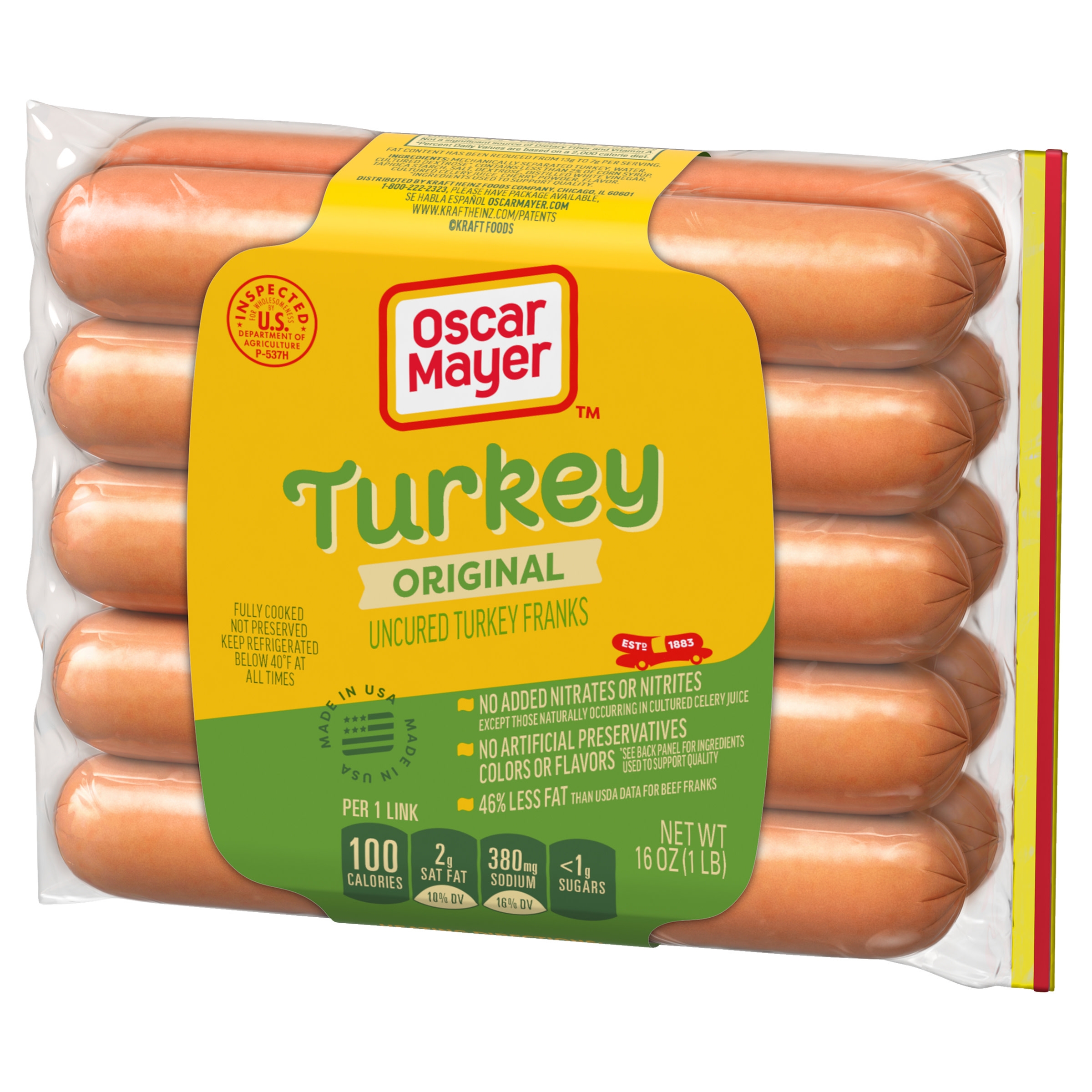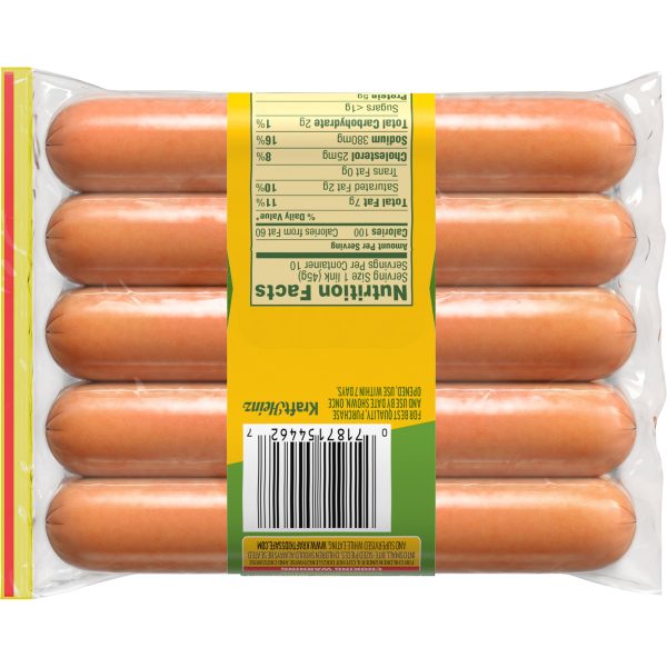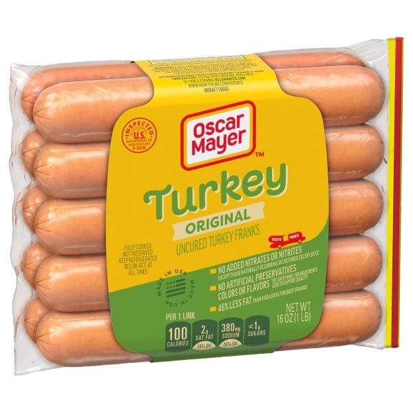 Oscar Mayer Uncured Turkey Franks deliver a quality hot dog taste you love with 46% less fat than USDA data for beef franks. Made from quality turkey meat, free of by-products, these uncured hot dogs have no artificial preservatives. Our uncured turkey dogs are free of nitrates and nitrates, except those naturally occurring in cultured celery juice, for a delicious summer grilling food. Prepare them on your barbecue grill, campfire or heat in a pan. Since these Oscar Mayer franks are fully cooked, you can heat them in the microwave or chop them up cold to use when cooking. The 10 pack comes in a 16-ounce resealable plastic pouch, keeping them fresh. Turkey hot dogs are a great addition to any summer spread for Memorial Day or Fourth of July BBQs.