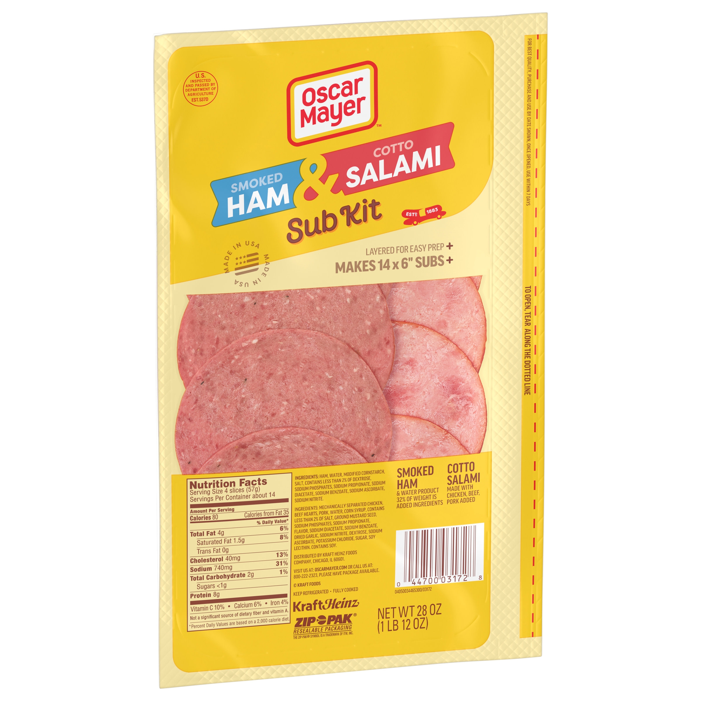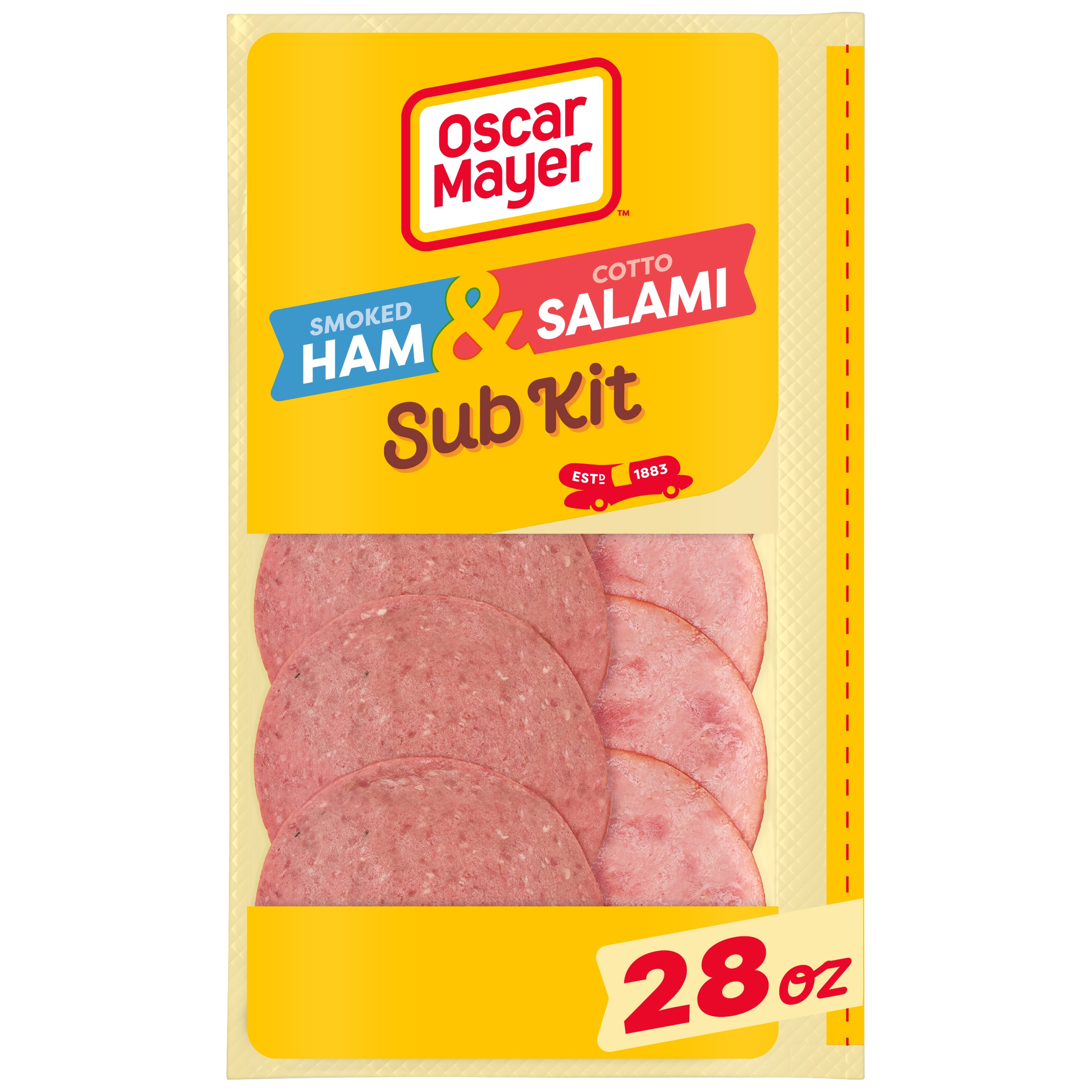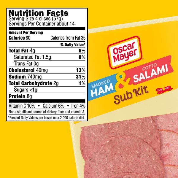 Oscar Mayer Smoked Ham (and water product) and Cotto Salami (made with chicken, pork & beef added) Subkit includes quality deli ham and salami lunch meat. With 80 calories per serving, ham lunch meat and cotto salami cold cuts make a delicious addition to a sub or croissant sandwich. This smoked ham and cotto cooked salami has a mouthwatering rich flavor that puts canned meat and canned ham to shame. Use this handy deli combo pack to make a ham and cotto salami melt in the oven, or create your own sub with all the fixin’s. Smoked ham and cotto salami also make perfect cold cut meats for school lunches, crafting your own sub at home or creating a deli platter filled with chicken breast and deli-sliced corn beef. This deli meat comes in a resealable 28 ounce package and offers both sliced ham and cotto salami in the same package – something to please everyone in the family.