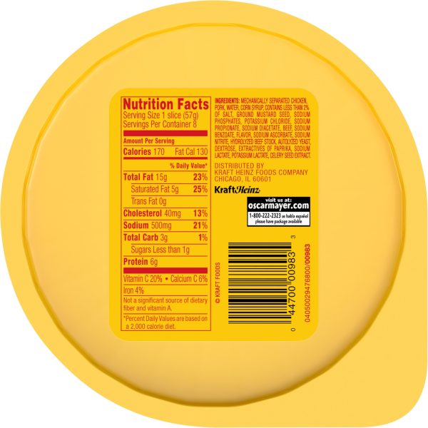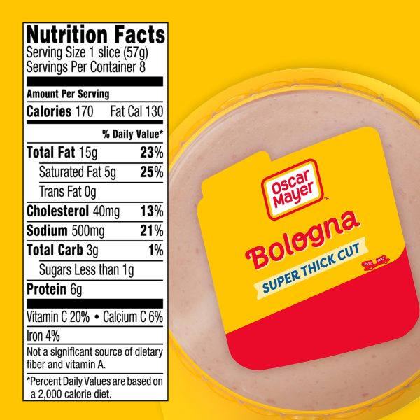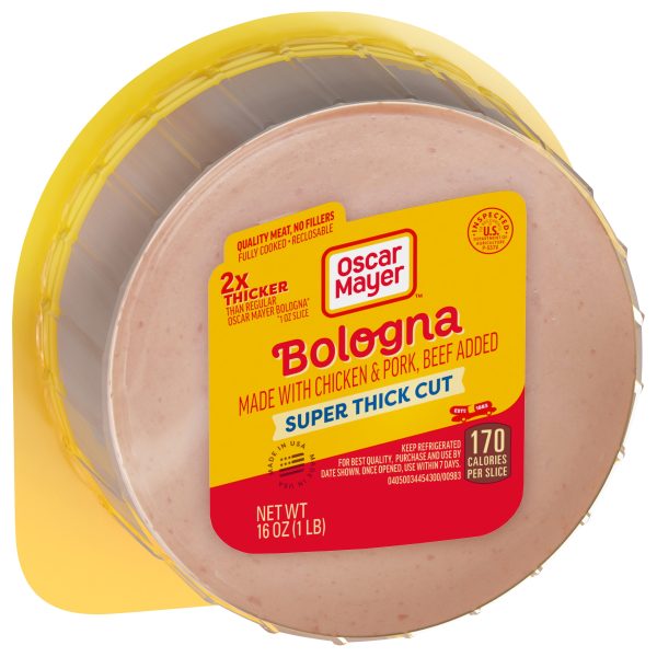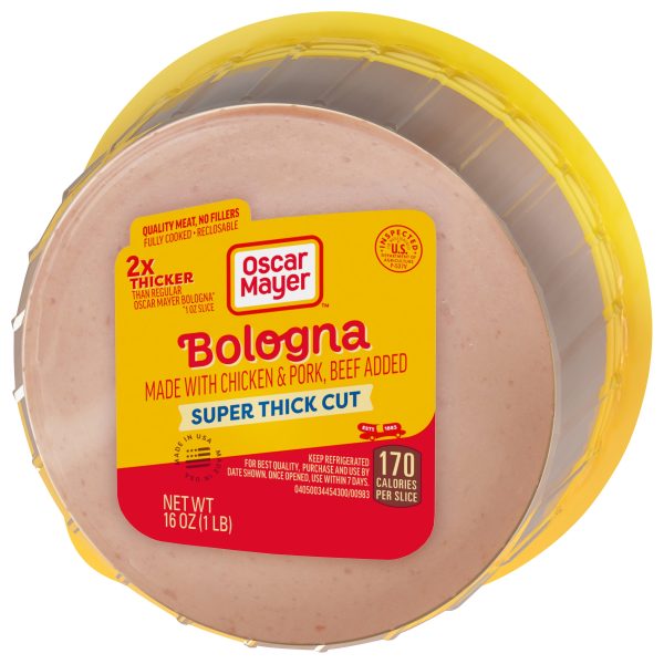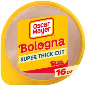 Oscar Mayer Super Thick Cut Bologna is made with quality meat and no fillers and is twice as thick as regular Oscar Mayer Bologna lunch meat. This bologna meat is made with chicken, pork and added beef that’s been inspected for wholesomeness by the U.S. Department of Agriculture. This is no vegetarian lunch meat! Enjoy bologna sandwich meat on wheat bread with a slice of American cheese, or add it to lunch meat trays that include deli-sliced corn beef and beef skirt steak, allowing party guests to mix and match catering sandwich platters. Oscar Mayer Super Thick Cut Bologna is ideal for parents and kids alike. These thick cut slices come in a recloseable 16 ounce pack to keep them fresh between meals. Oscar Mayer offers many different types of deli meat, so shop our large selection today.
