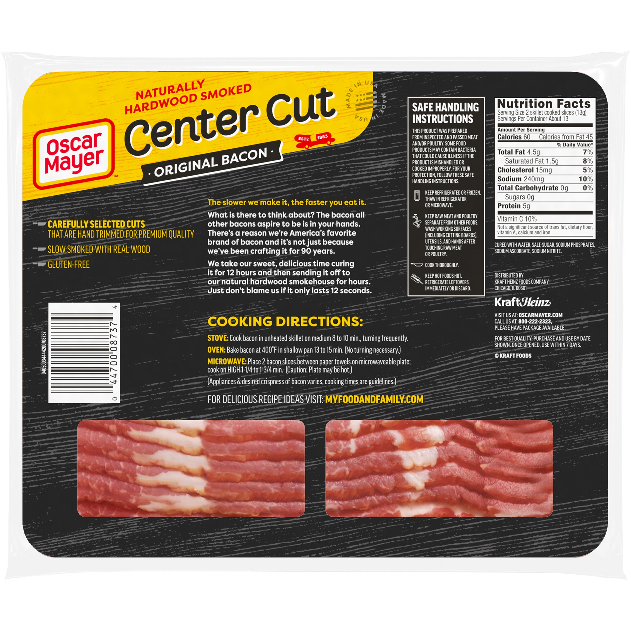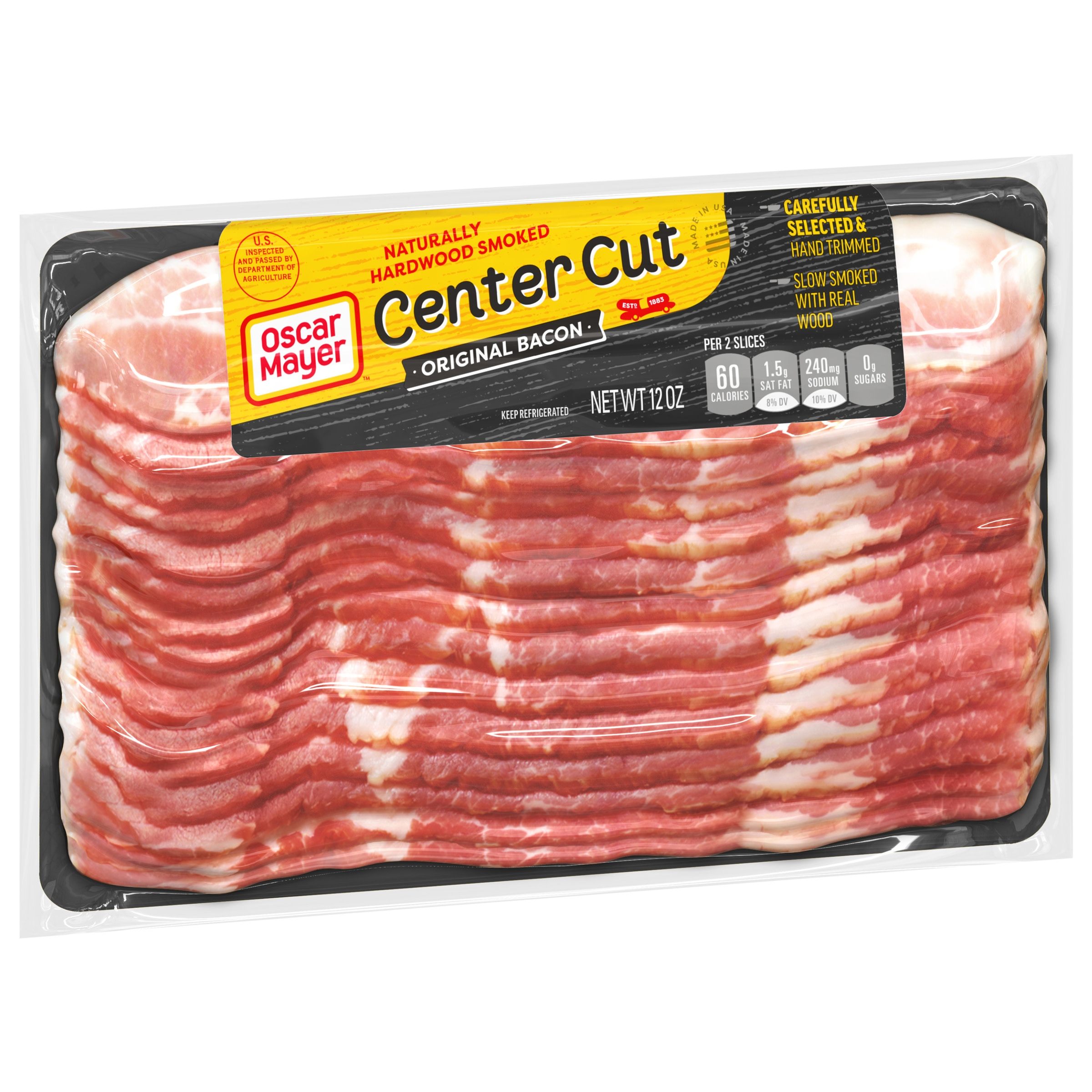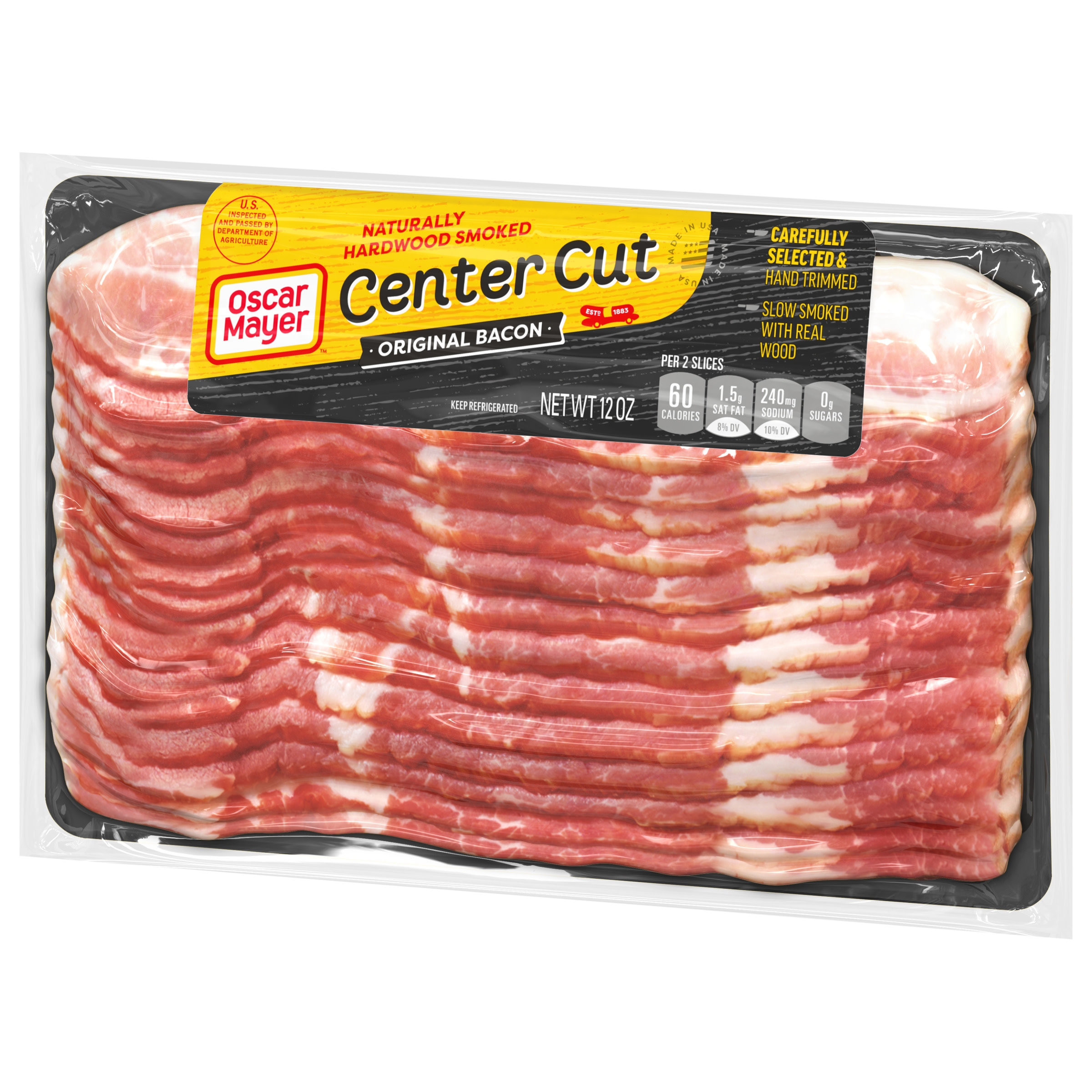 Everything is better with bacon. Oscar Mayer Center Cut Original Bacon Slices come from carefully selected cuts of pork for irresistible flavor. Our delicious center cut bacon is hand-trimmed and slow smoked with real wood. Elevate a breakfast sandwich or a classic BLT with our naturally hardwood smoked bacon. Fry a few slices for bacon and eggs, or chop it up and add center cut smoked bacon to any of your favorite dishes. Crumble a slice into bacon bits or try pairing with a breakfast sausage in the morning. Keep our 12-ounce vacuum sealed package with about 18 slices of bacon refrigerated and use within seven days once opened.
