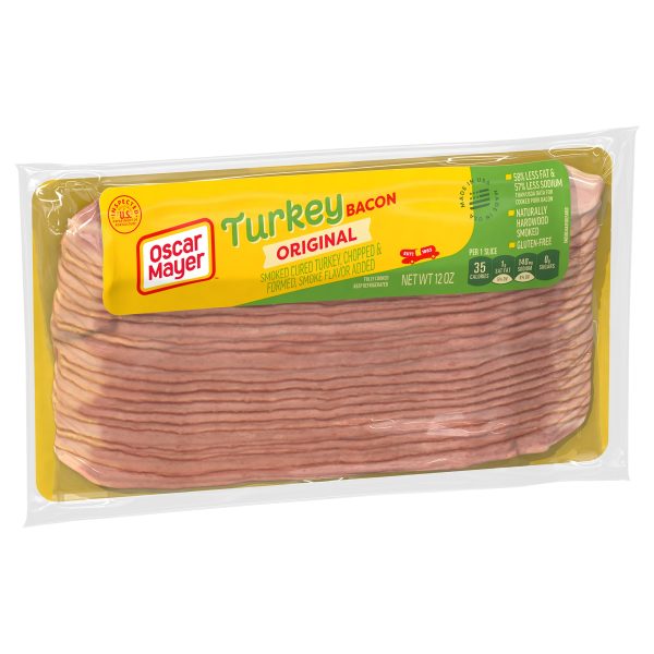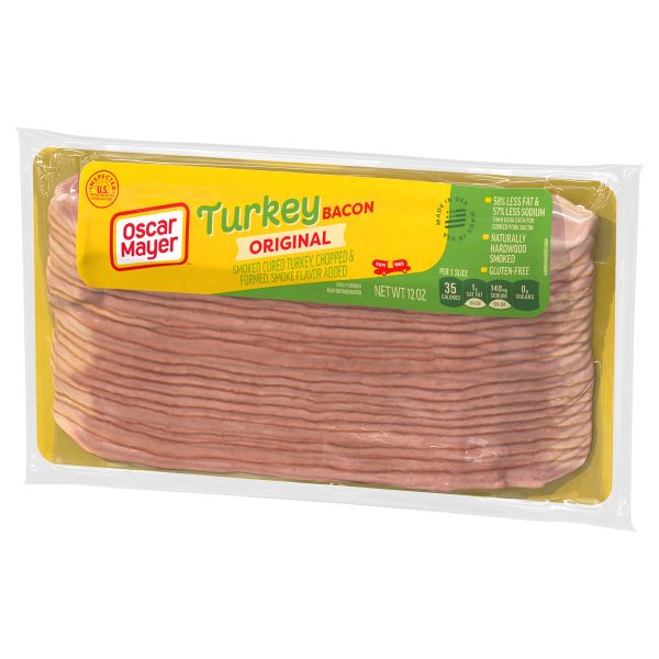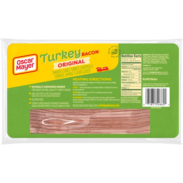 Everything is better with turkey bacon. Oscar Mayer Turkey Bacon smoked cured turkey, chopped & formed, smoke flavor added has 58% less fat and 57% less sodium than USDA data for cooked pork bacon without sacrificing the flavor you crave. Our fully cooked turkey bacon that is raised without hormones* minimizes prep time, making it easier to create delicious meals in a hurry. Heat our turkey bacon on the stove, in the oven or microwave to your desired crispness. Taste the natural hardwood smoke flavor that makes Oscar Mayer turkey bacon the perfect addition to breakfast sandwiches and BLTs. Enjoy turkey bacon with eggs, try it as a savory salad topping or add some slices to your next turkey burger. Discover the endless possibilities of precooked turkey bacon. Oscar Mayer Smoked Cured Gluten Free Fully Cooked Turkey Bacon is vacuum packed in a resealable 12-ounce package with 21-23 slices. *federal regulations prohibit the use of hormones in turkey