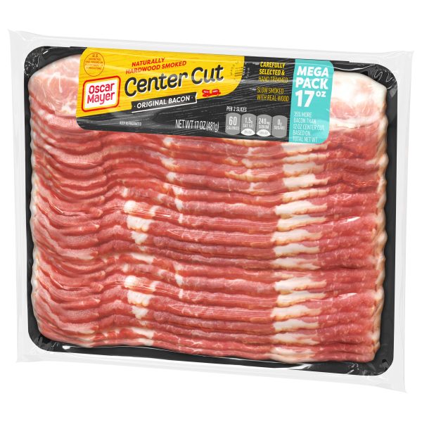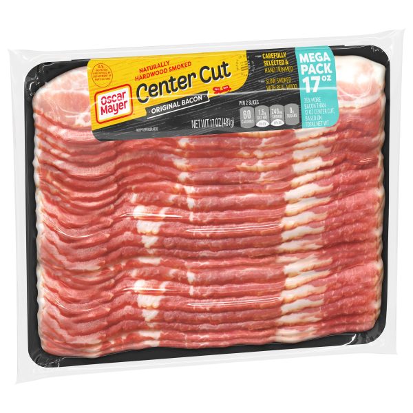 Everything is better with bacon. Oscar Mayer Original Center Cut Bacon slices come from carefully selected cuts of pork for an irresistible flavor. Our delicious center cut bacon is hand-trimmed and slow smoked with real wood. Elevate a breakfast sandwich or a classic BLT with our naturally hardwood smoked bacon. Fry a few slices for bacon and eggs, or chop it up and add center cut smoked bacon to any of your favorite dishes. Crumble a slice into bacon bits or try pairing with a breakfast sausage in the morning. Keep our 17-ounce mega pack vacuum sealed package with about 26 slices of bacon refrigerated and use within seven days once opened.
