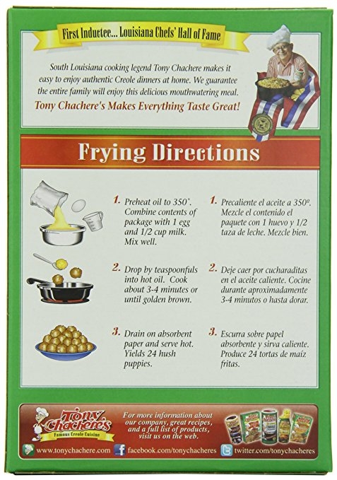 Cornmeal and Creole spices come together to create the perfect complement to your seafood dinner. Tony Chachere?s Crispy Creole Hush Puppy Mix blends spices together to create a crispier and more flavorful version of one of Louisiana?s favorite side dishes.