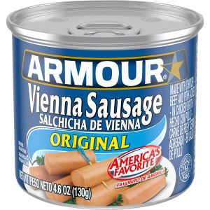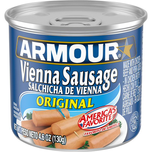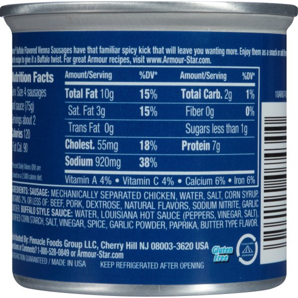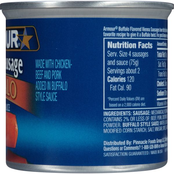 Armour Star Buffalo Flavored Vienna Sausage are ready to eat sausages with great flavor. The Vienna sausages are made with chicken, have beef and pork added and include a bold buffalo sauce that adds a spicy kick. This Vienna sausage can be eaten right out of the can, so you can enjoy this canned meat as a ready to eat sausage snack. Try adding the canned sausage to your favorite recipes for an easy meal, or serve them as an appetizer everybody will love. Store the canned food in your pantry so you always have some delicious Vienna sausage on hand. Keep the spicy sausage refrigerated after opening to keep fresh for next time. Make any time Armour Star time.