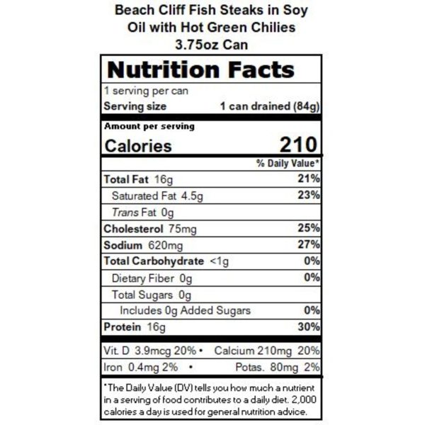 Beach Cliff Fish Steaks in Soybean Oil with Hot Green Chilies, 3.75 oz