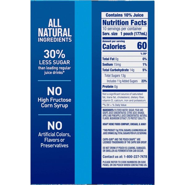 ?Each pouch contains 30% less sugar than leading regular juice drinks (This product 13 g total sugar; leading regular juice drinks 20 g total sugar per 6 fl. oz. serving)