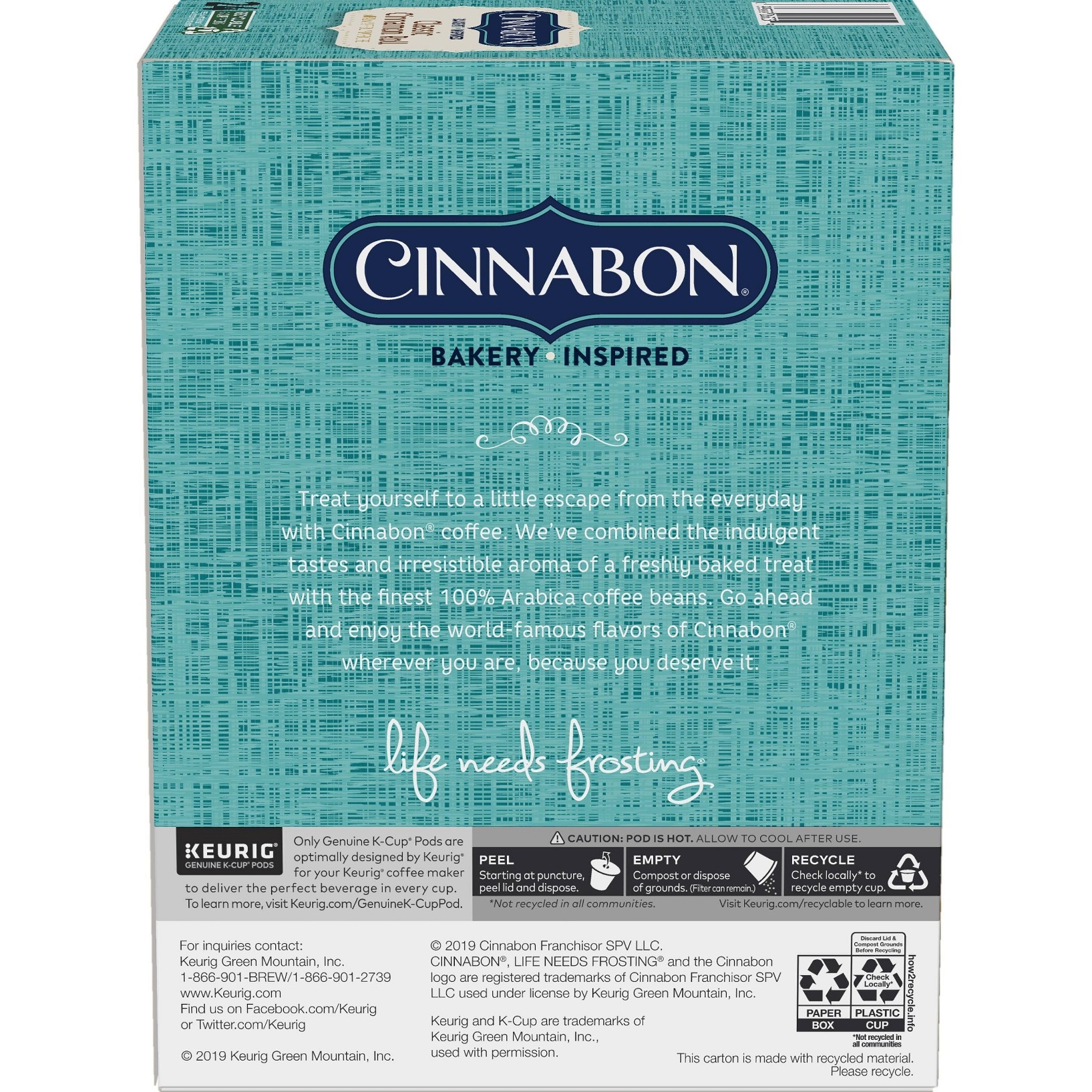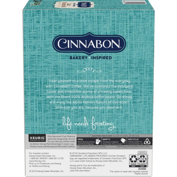 u0026bull;Swirled with Cinnabon cinnamon brown sugar and frostingu003cbru003eu0026bull;Light roast, caffeinated coffeeu003cbru003eu0026bull;Orthodox Union Kosheru003cbru003eu0026bull;Compatible with Keurig® K-Cup® pod single-serve coffee makersu003cbru003eu0026bull;A cup of delicious perfectionu003cbru003eu0026bull;RECYCLABLE* K-CUP PODS: Simple. Delicious. And Recyclable. Enjoy the same great-tasting coffee you know and love, and when you’re done just peel, empty and recycle. *Check locally, not recycled in all communities. Packaging may vary.