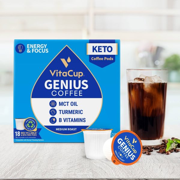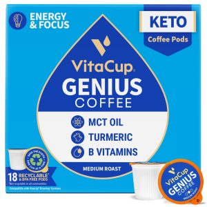 u0026bull;ENERGY u0026 FOCUS: This infusion of MCT oil, cinnamon, and turmeric is the secret weapon of the bold and brainy! This next-level trio packs a serious punch with properties that boost energy and focus.u003cbru003eu0026bull;KETO-FRIENDLY: Energize your inner genius with an infusion of MCT (medium-chain triglyceride) oil – a Keto-friendly healthy fat.u003cbru003eu0026bull;DAILY VITAMINS : Get your daily vitamins from one cup of coffee. A powerhouse blended vitamin infusion of B1, B5, B6, B9, B12 and D3 to make it easy getting nutrients to power your body. Vitamin D, made from the same vitamin D produced naturally in our bodies from the sun, supports happy moods and immunity.u003cbru003eu0026bull;QUALITY COFFEE: Enjoy a smooth, and richly complex, full-bodied medium roast using 100% Arabica beans that are roasted, blended, and nitrogen sealed.u003cbru003eu0026bull;100% RECYCLABLE SINGLE SERVE COFFEE PODS: Vitacup believes that we all can be socially responsible. Our coffee pods are made from recyclable #5 plastic materials and feature easy peel tabs to ensure recyclability. They are designed for use with nearly all single service compatible Keurig KCup brewers, including 2.0 machines.
