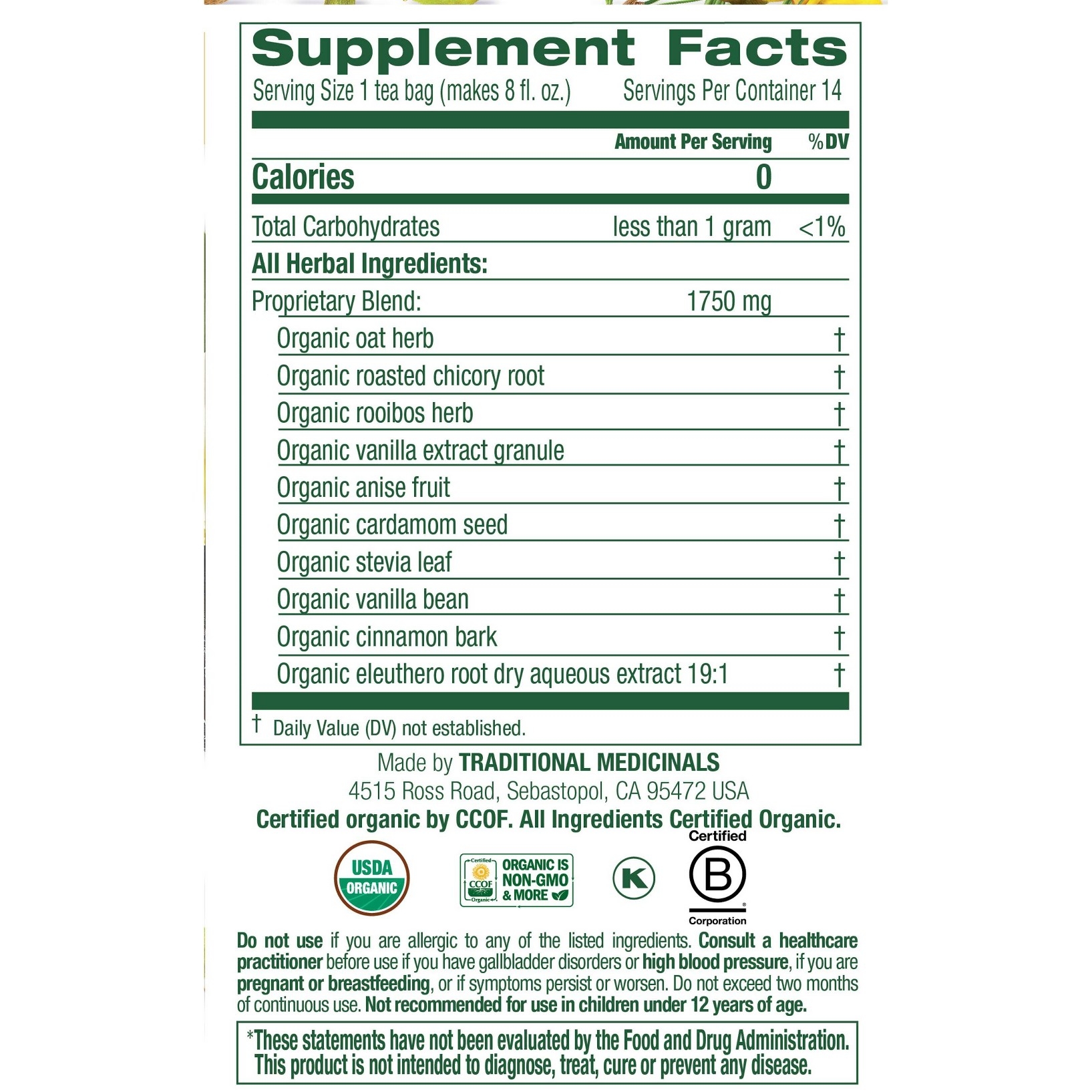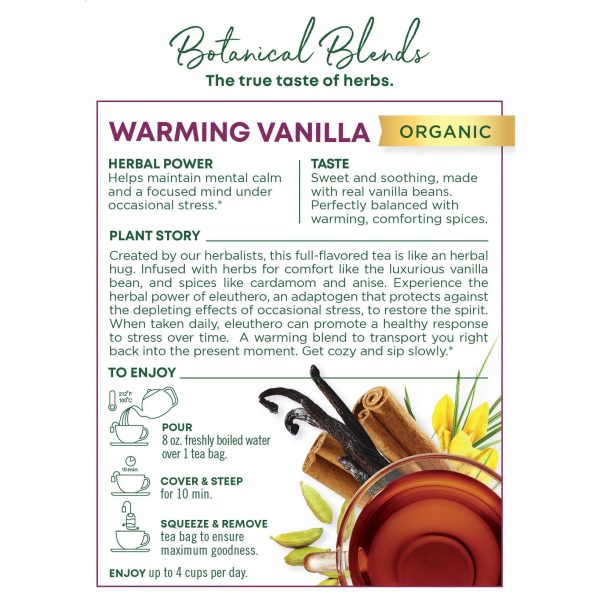 u0026bull;TASTE: Sweet and soothing, made with real vanilla beans. Perfectly balanced with warming, comforting spices.u003cbru003eu0026bull;HERBAL POWER: Helps maintain mental calm and a focused mind under occasional stress.*u003cbru003eu0026bull;PLANT STORY: Created by our herbalists, this full-flavored tea is infused with herbs for comfort like the luxurious vanilla bean, and spices like cardamom and anise.u003cbru003eu0026bull;Experience the herbal power of eleuthero, an adaptogen that protects against the depleting effects of occasional stress, to restore the spirit.u003cbru003eu0026bull;USDA Certified Organic. Non-GMO Verified. Kosher. Caffeine Free. Certified B Corp. Compostable Tea Bags.u003cbru003eu0026bull;1 box containing 14 tea bags