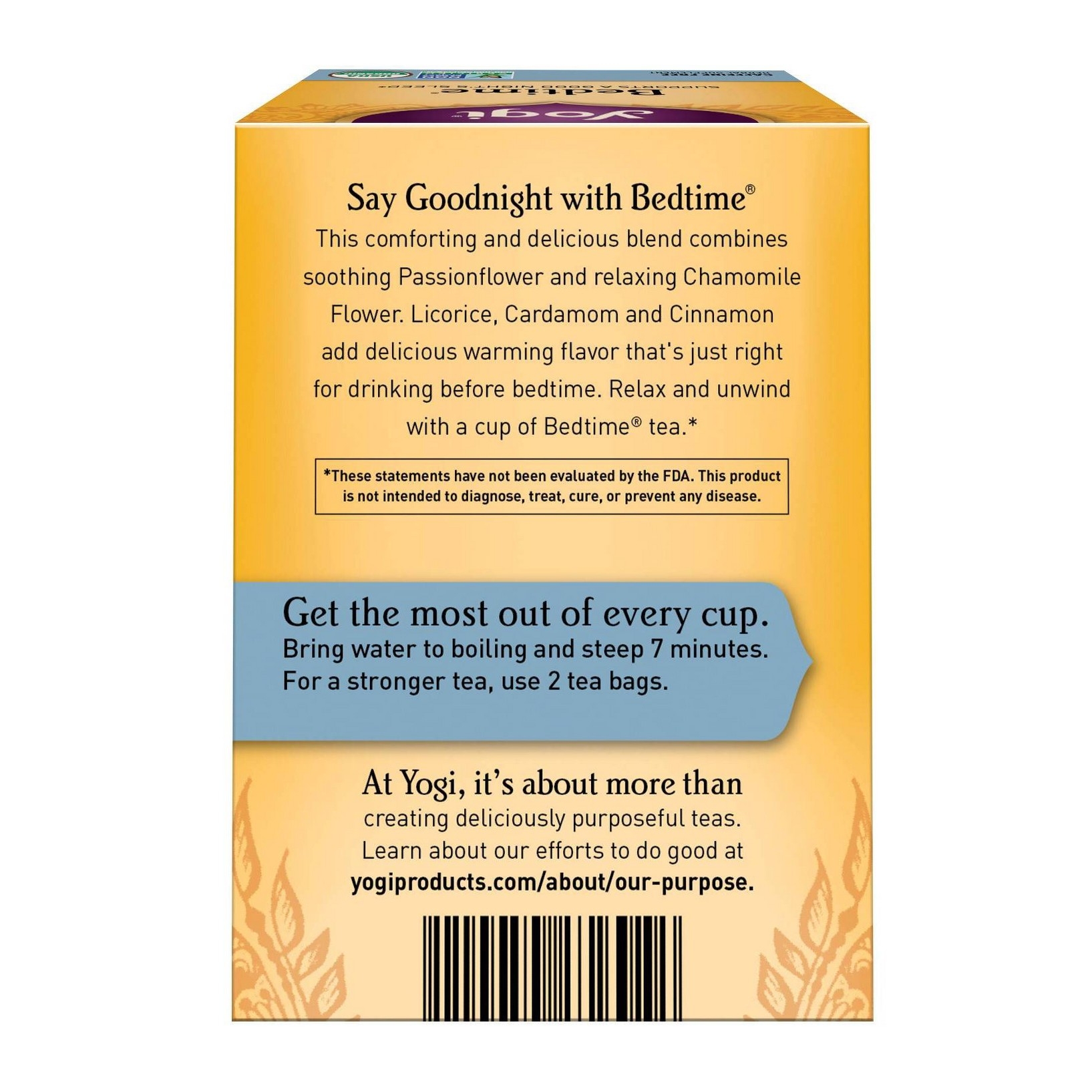 u0026bull;SUPPORTS A GOOD NIGHT’S SLEEP*u003cbru003eu0026bull;FLAVOR: Yogi Bedtime tea combines Passionflower and Chamomile with Licorice, Cardamom, and Cinnamon for a naturally spicy-sweet herbal tea blend.u003cbru003eu0026bull;BENEFITS: This soothing herbal blend is purposefully formulated to support relaxation, and is perfect for enjoying before bedtime to help you unwind.u003cbru003eu0026bull;ORGANIC: USDA Certified Organic and Non-GMO Project Verified.u003cbru003eu0026bull;CONTENTS: Caffeine-free, Vegan, Kosher, Gluten-free, No Artificial Flavors or Sweeteners, and individually packaged in compostable tea bags.