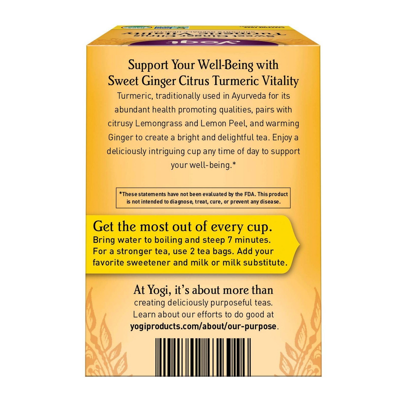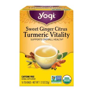 u0026bull;FLAVOR: Yogi Sweet Ginger Citrus Turmeric Vitality tea combines citrusy Lemongrass and Lemon Peel with warming Ginger for a bright and delightful herbal tea.u003cbru003eu0026bull;BENEFITS: This herbal blend features Turmeric, traditionally used in Ayurveda for its abundant health-promoting qualities, to help support overall health and well-being.u003cbru003eu0026bull;ORGANIC: USDA Certified Organic and Non-GMO Project Verified.u003cbru003eu0026bull;CONTENTS: Caffeine-free, Vegan, Kosher, Gluten-free, No Artificial Flavors or Sweeteners, and individually packaged with compostable bags.