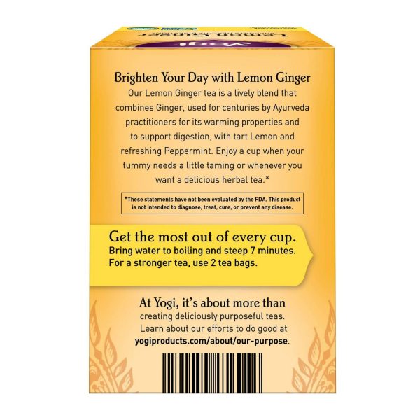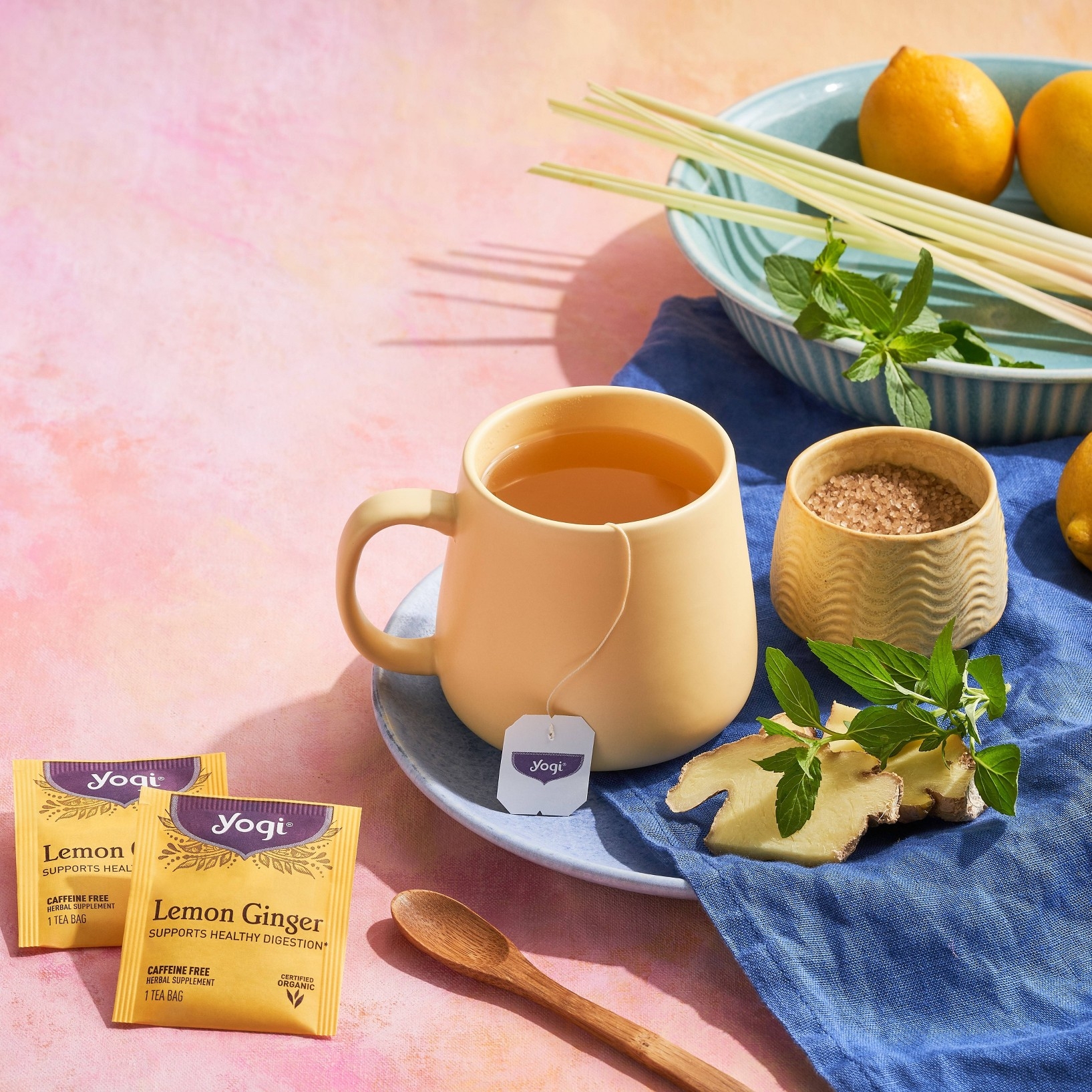 u0026bull;FLAVOR: Yogi Lemon Ginger tea combines lively Ginger, tart Lemon Peel, and Peppermint Leaf for a perfectly spiced and citrus-y blend.u003cbru003eu0026bull;BENEFITS: This warming herbal blend combines Ginger and Peppermint to soothe your stomach and support healthy digestion.u003cbru003eu0026bull;ORGANIC: USDA Certified Organic and Non-GMO Project Verified.u003cbru003eu0026bull;CONTENTS: Caffeine-free, Vegan, Kosher, Gluten-free, No Artificial Flavors or Sweeteners, and individually packaged in compostable tea bags.