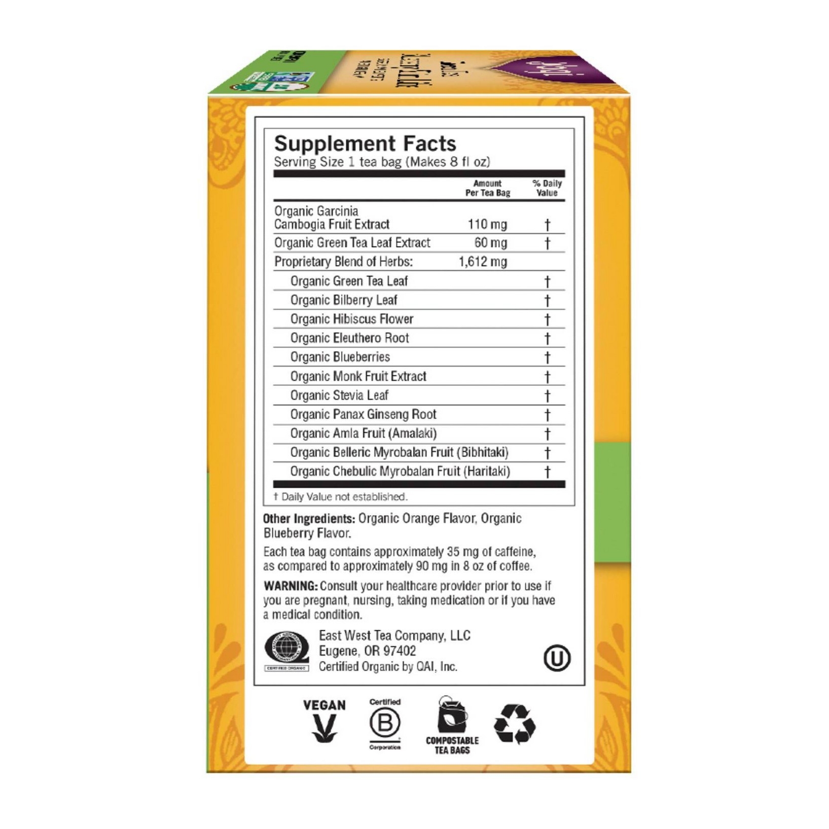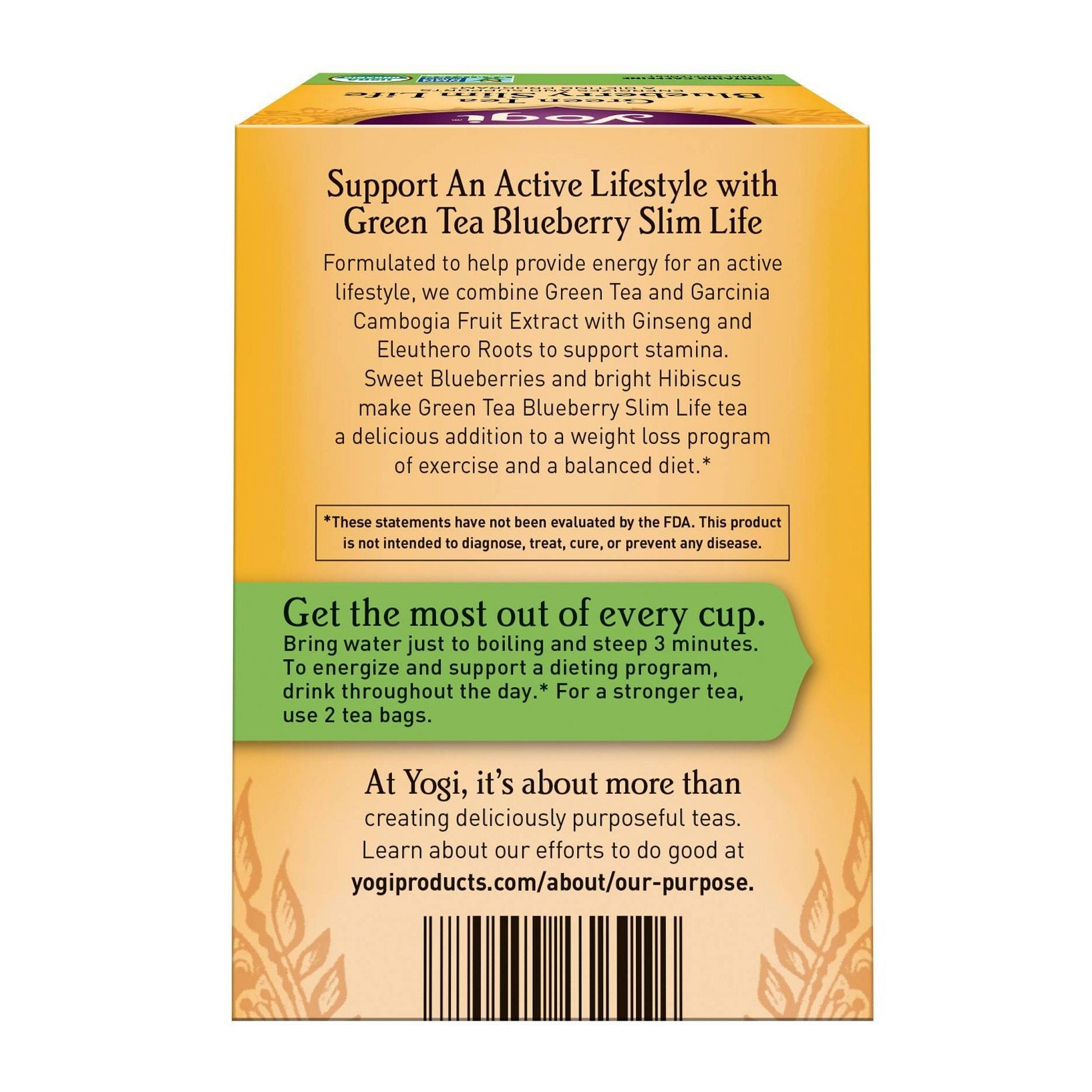 u0026bull;ENERGIZES AND SUPPORTS A DIETING PROGRAM*u003cbru003eu0026bull;FLAVOR: Yogi Green Tea Blueberry Slim Life tea combines bold Green Tea with bright Hibiscus and sweet Blueberries for a refreshing and lightly sweet Green Tea blend.u003cbru003eu0026bull;BENEFITS: Garcinia Cambogia Fruit Extract, Panax Ginseng Root, and Eleuthero Root support stamina in this energizing Green Tea blend that’s a delicious addition to a weight loss program when accompanied with exercise and a balanced diet.u003cbru003eu0026bull;ORGANIC: USDA Certified Organic and Non-GMO Project Verified.u003cbru003eu0026bull;CONTENTS: Contains caffeine, Vegan, Kosher, Gluten-free, No Artificial Flavors or Sweeteners, and individually packaged with compostable bags.