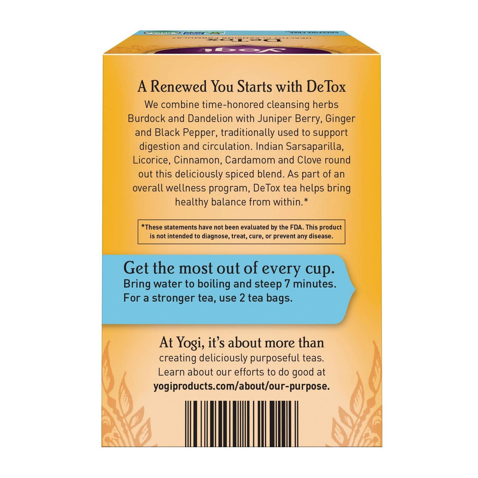 u0026bull;HEALTHY CLEANSING FORMULA*u003cbru003eu0026bull;FLAVOR: Yogi DeTox tea combines Ayurvedic warming spices including Ginger, Black Pepper, Cinnamon, Cardamom, and Clove with Indian Sarsaparilla and Licorice for a deliciously spiced blend.u003cbru003eu0026bull;BENEFITS: Time-honored cleansing herbs, including Dandelion and Burdock, combine with Ayurvedic warming spices to help support healthy cleansing.u003cbru003eu0026bull;ORGANIC: USDA Certified Organic and Non-GMO Project Verified.u003cbru003eu0026bull;CONTENTS: Caffeine-free, Vegan, Kosher, Gluten-free, No Artificial Flavors or Sweeteners, and individually packaged with compostable bags.