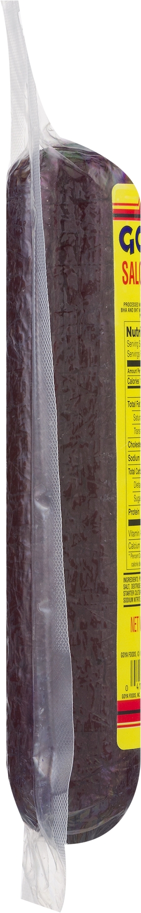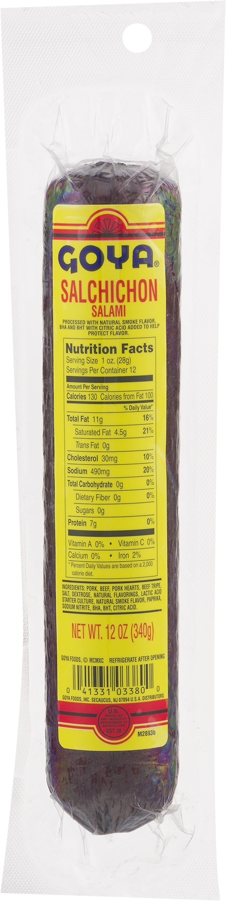 Satisfy your cravings with some Goya Salchichon Salami. It makes a delicious choice for sausage lovers. Carefully sealed to preserve freshness, this Goya food is spiced with traditional seasonings like salt and paprika and has a natural smoked flavor. It also has a nice and hearty texture. Enjoy some Goya salami as a pizza topping, by itself or added to foods like lentil soup or spicy jambalaya.