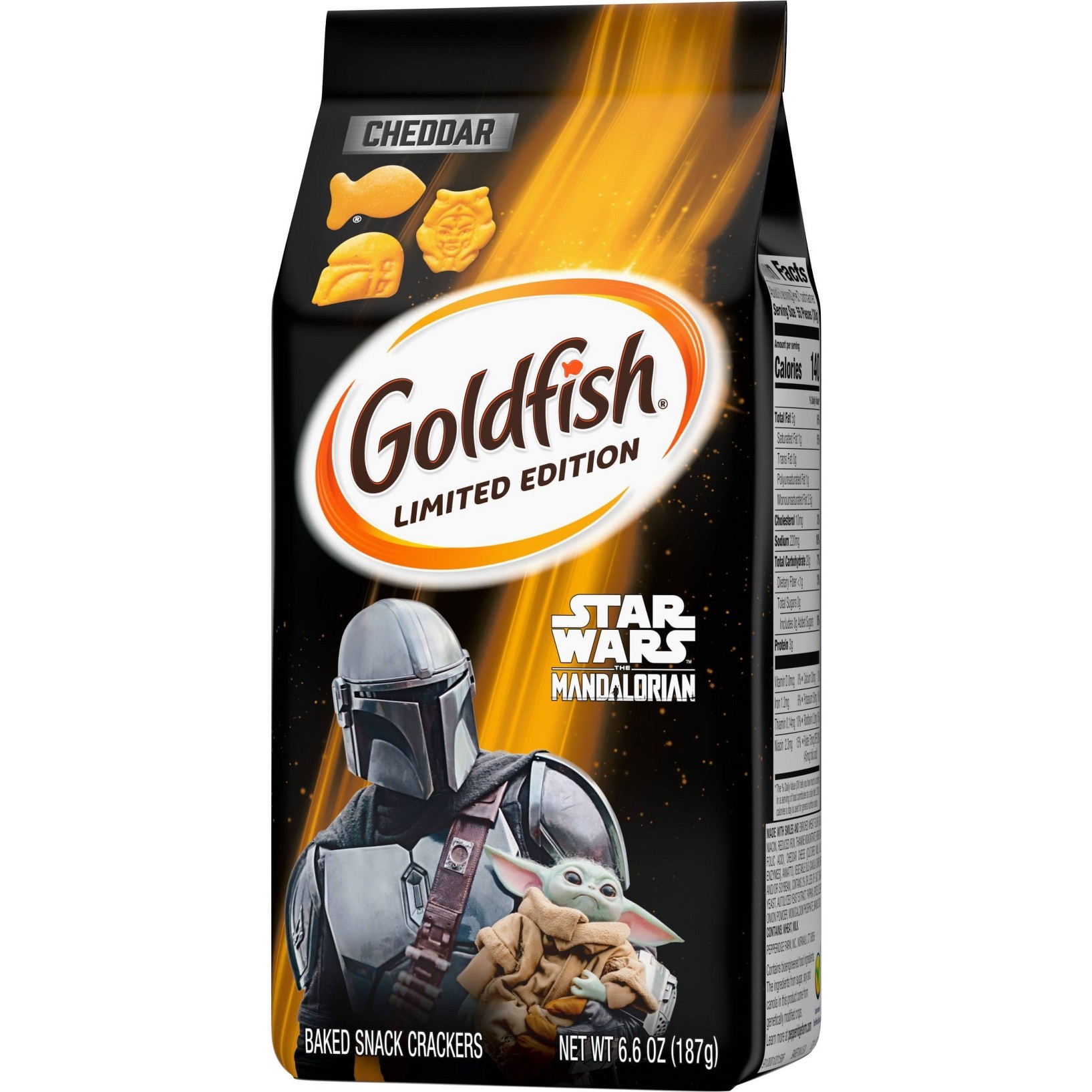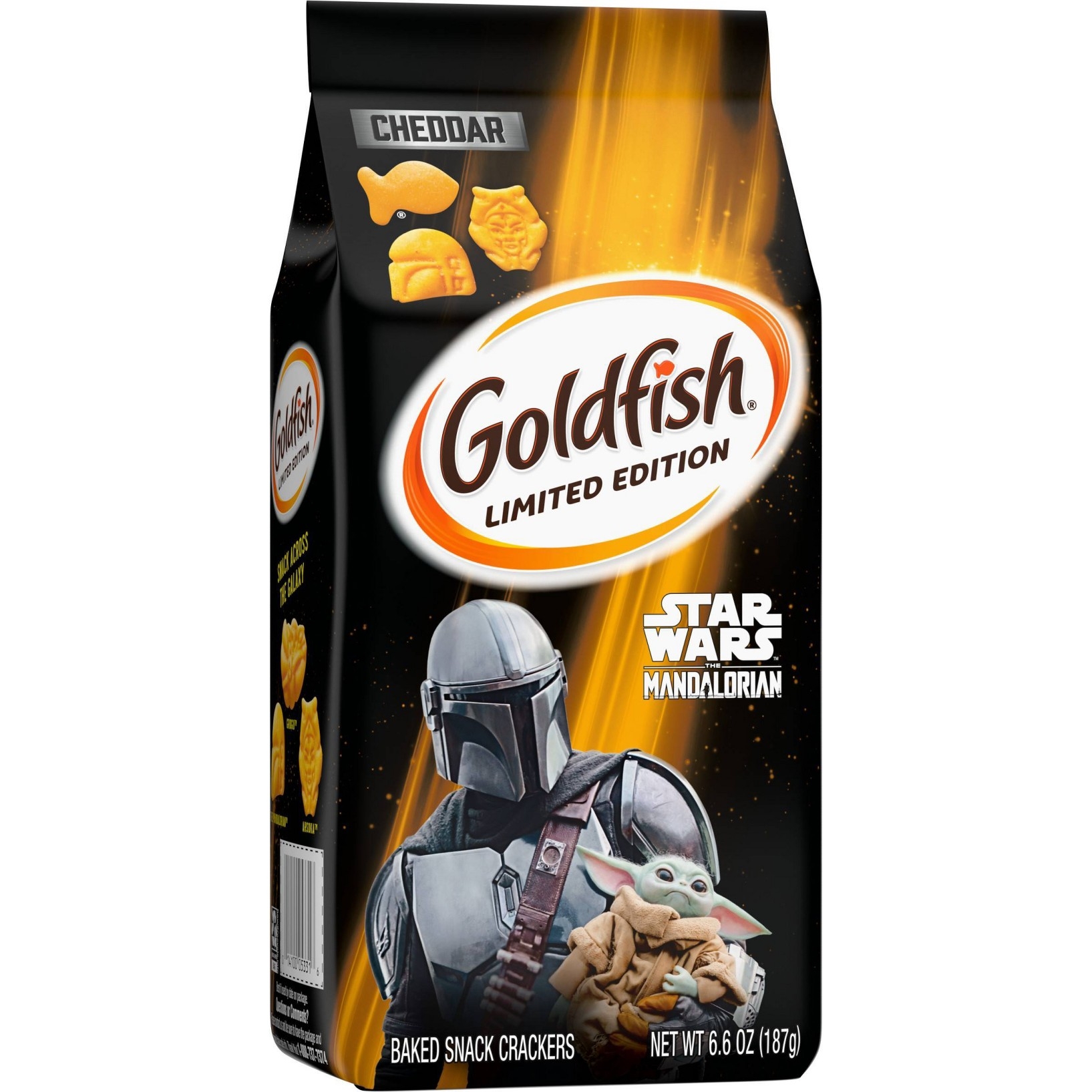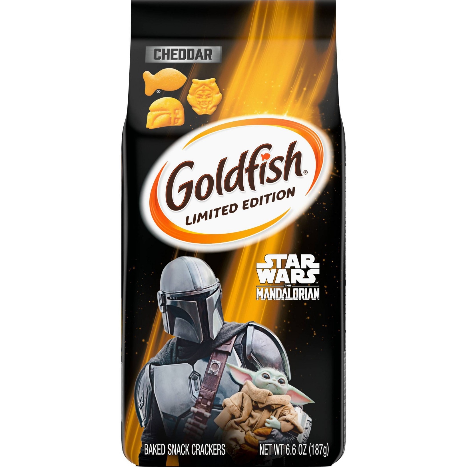 u0026bull;STAR WARS MANDALORIAN: Out of this world snack crackers, with Mandalorian-themed shapes that make snacking fun for everyoneu003cbru003eu0026bull;SPECIAL EDITION: The Mandalorian Cheddar crackers are only available for a limited time. Snack them while you can!u003cbru003eu0026bull;PERFECT FOR SHARING OR FOR ENJOYING SOLO: The great taste of Goldfish snack crackers is perfect for hanging out with friends, or taking a snack break any time the mood hitsu003cbru003eu0026bull;BAKED WITH REAL CHEESE: Our Star Wars-themed crackers are always baked with 100% real cheese, and no artificial flavors or preservativesu003cbru003eu0026bull;ALWAYS BAKED, NEVER FRIED: Keep munchable, crunchable Goldfish crackers around for anytime snacking that everyone can feel good about