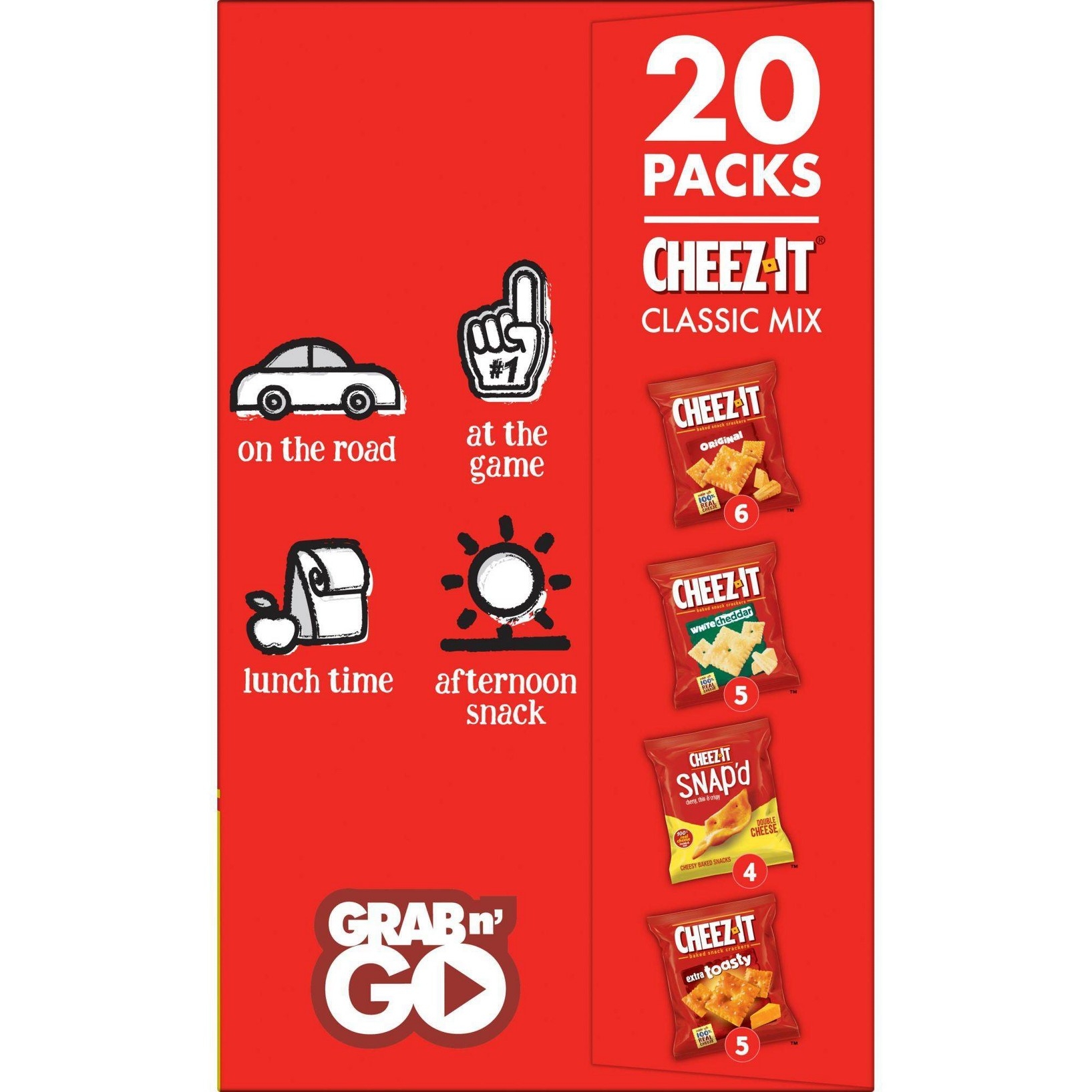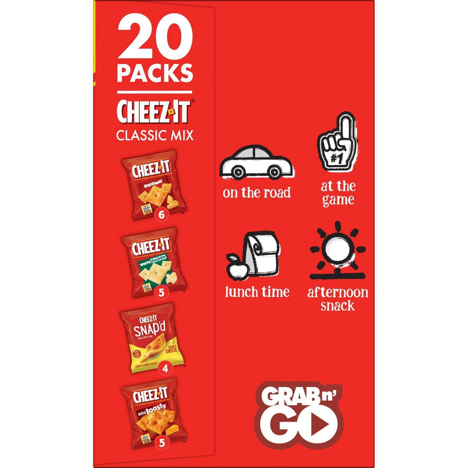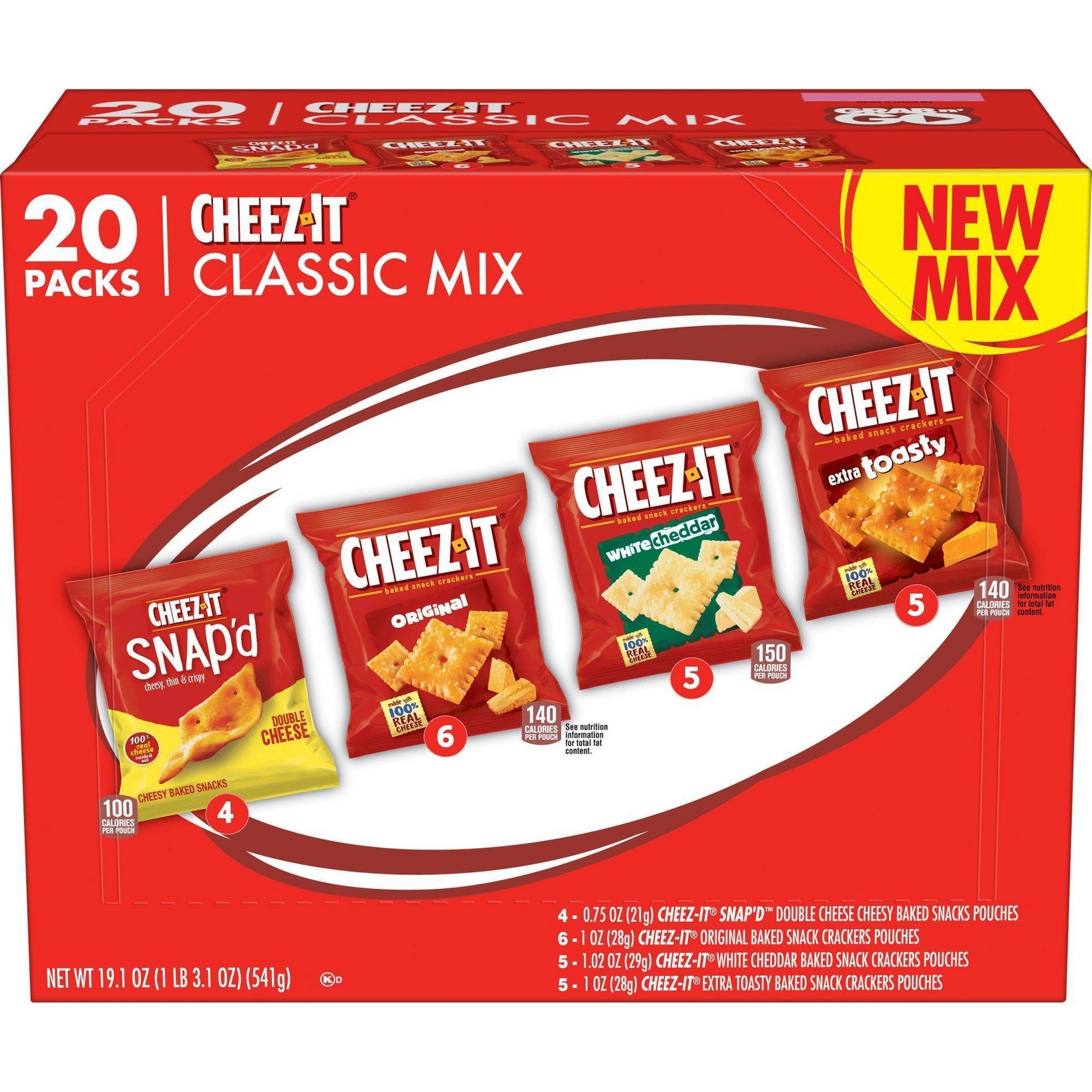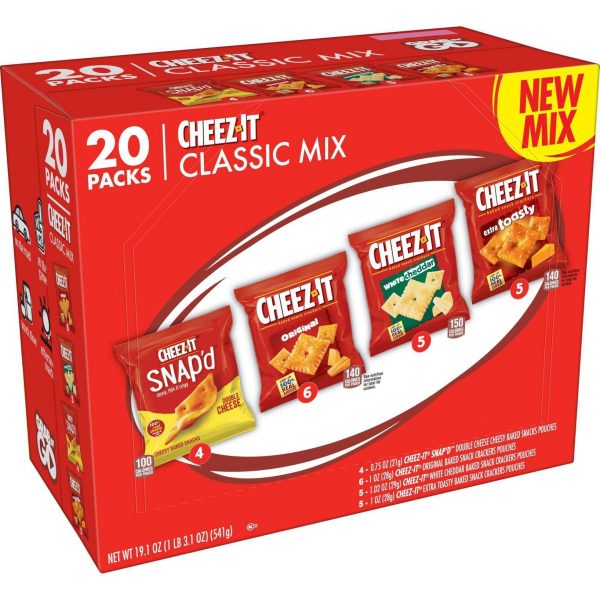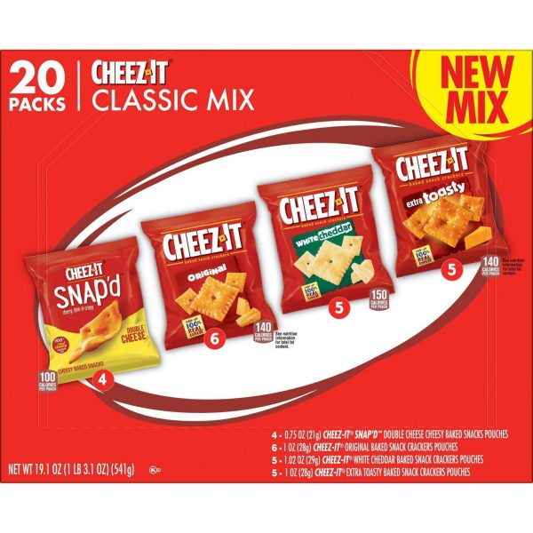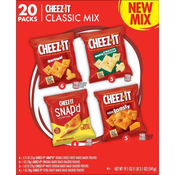u0026bull;Cheesy baked snacks; A variety pack that includes Cheez-It Original, White Cheddar, Extra Toasty, and Cheez-It Snap’d Double Cheeseu003cbru003eu0026bull;Cheesy, crunchy, and irresistibly delicious, Cheez-It is a family-favorite snack that pleases both kids and adultsu003cbru003eu0026bull;Made with 100% real cheese aged for a bold taste; Contains wheat, milk, and soy ingredients; Kosher dairyu003cbru003eu0026bull;A travel-ready food; Makes a tasty bite at home or on the go; Ideal for gatherings, parties, snack spreads, and more; Stow in lunchboxes, totes, and backpacksu003cbru003eu0026bull;Includes 1, 19.1-ounce box of 20 single serving pouches; 6, 1-ounce pouches of Original, 5, 1.02-ounces pouches of White Cheddar, 5, 1-ounce pouches of Extra Toasty, and 4, .75-ounce pouches of Snap’d Double Cheese