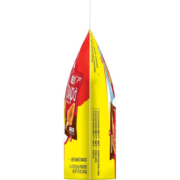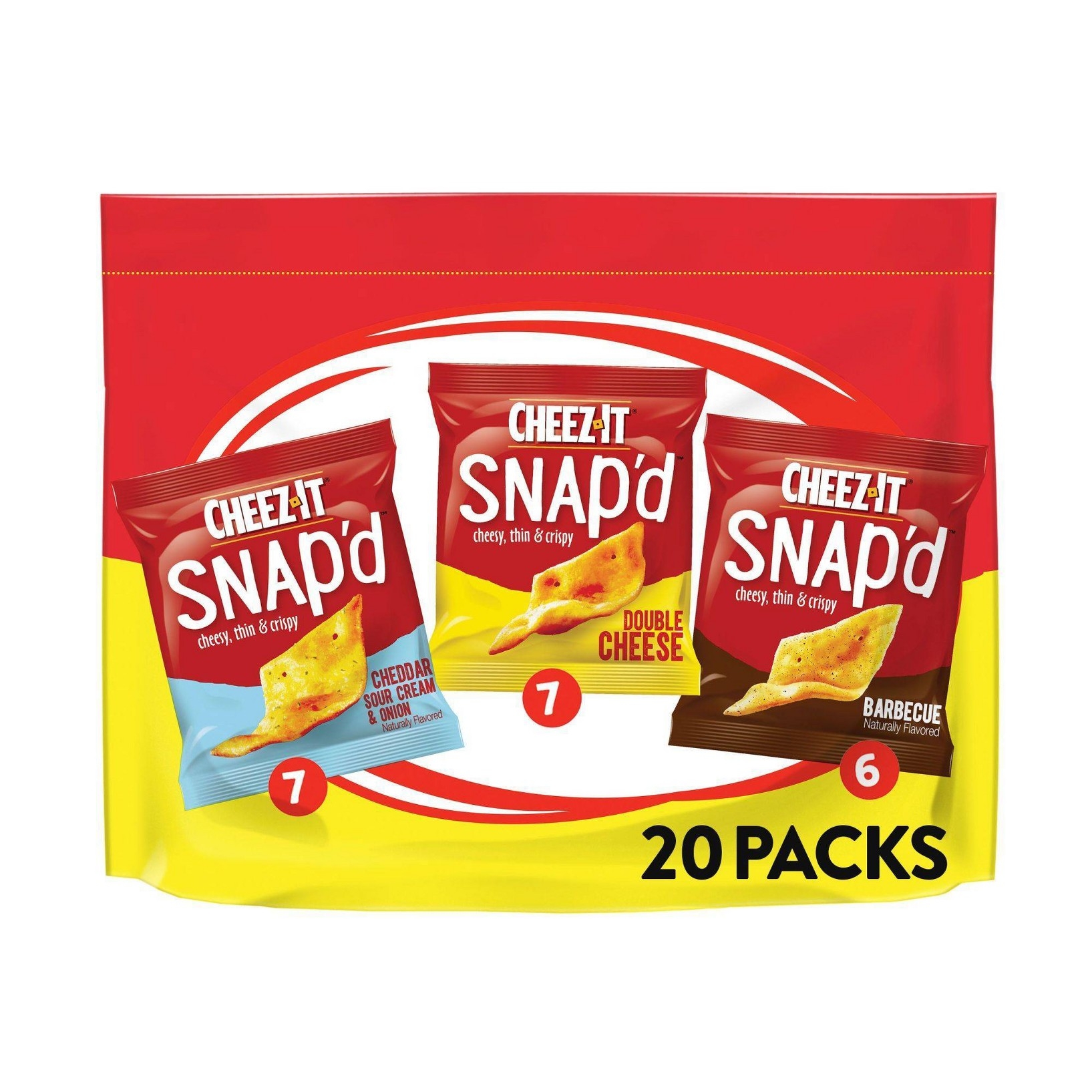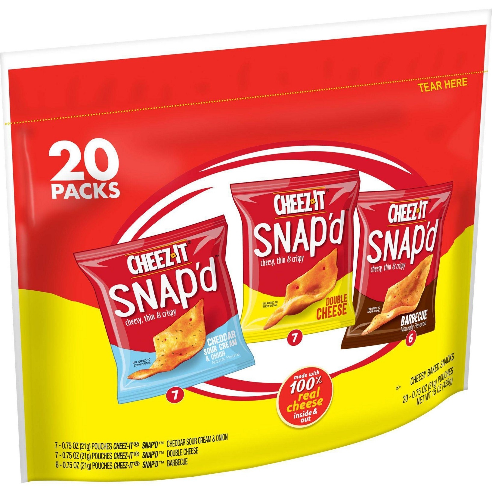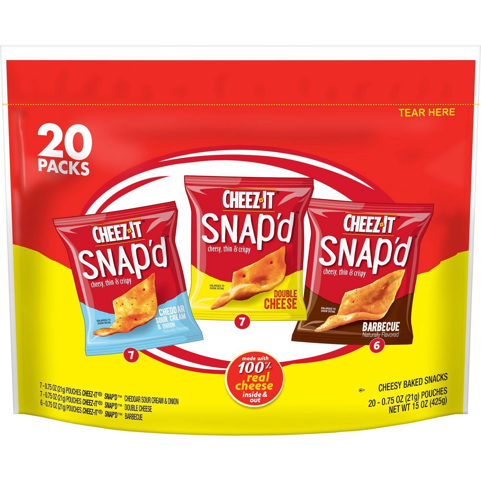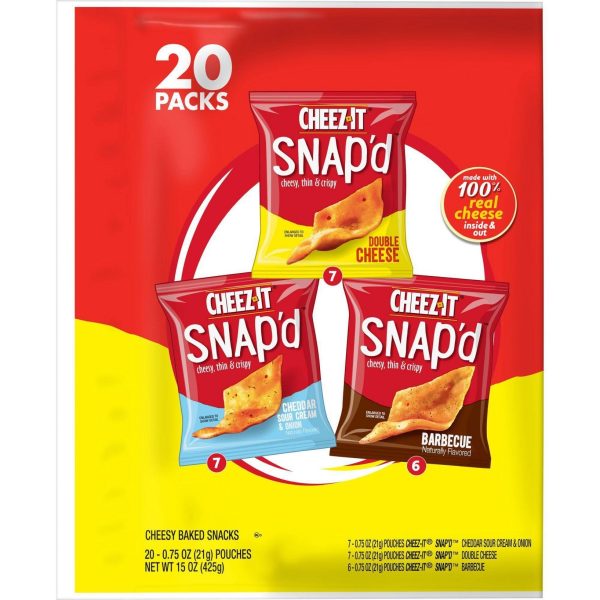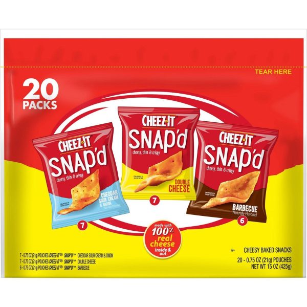 u0026bull;Thin and crispy cheesy baked snacks with big cheese taste inside and outu003cbru003eu0026bull;Turn up the cheese volume with the satisfying crunch of Cheez-It Snap’du003cbru003eu0026bull;Made with 100% real cheese; Kosher dairy, Contains wheat, milk and soy ingredientsu003cbru003eu0026bull;An anytime snack that makes a tasty bite at home or on the go; Enjoy during lunch, as a crunchy side to your soup, salad, or sandwichu003cbru003eu0026bull;A 15-ounce bag containing 7, .75-ounce pouches of Snap’d Double Cheese, 7, .75-ounce pouches of Snap’d Cheddar Sour Cream and Onioin, and 6, .75-ounce pouches of Snap’d BBQ