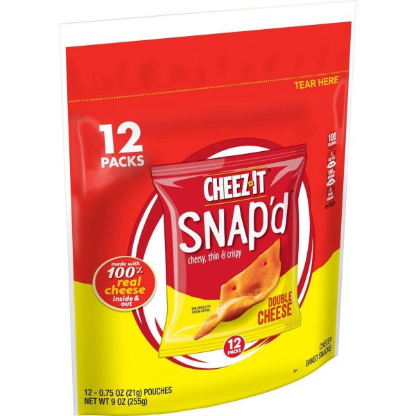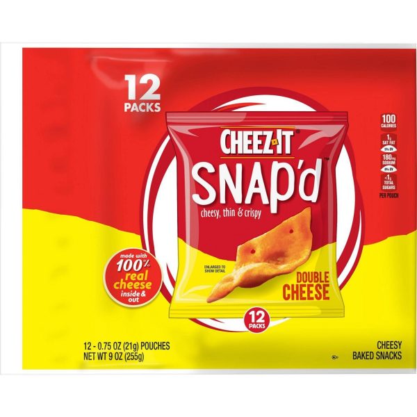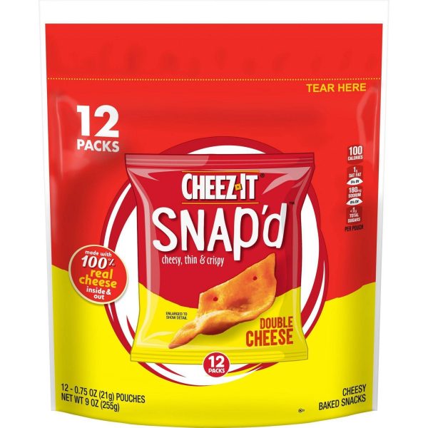 u0026bull;Cheesy, thin and crispy baked snacks with big cheese taste inside and outu003cbru003eu0026bull;Turn up the cheese volume with the satisfying crunch of Cheez-It Snap’du003cbru003eu0026bull;Made with 100% real cheese; Kosher dairy, Contains wheat, milk and soy ingredientsu003cbru003eu0026bull;An anytime snack that makes a tasty bite at home or on the go; Enjoy during lunch, as a crunchy side to your soup, salad, or sandwichu003cbru003eu0026bull;Includes 1, 9-ounce bag containing 12, .75-ounce bags of ready-to-eat cheesy baked snacks in every bag; Packaged for freshness and great taste
