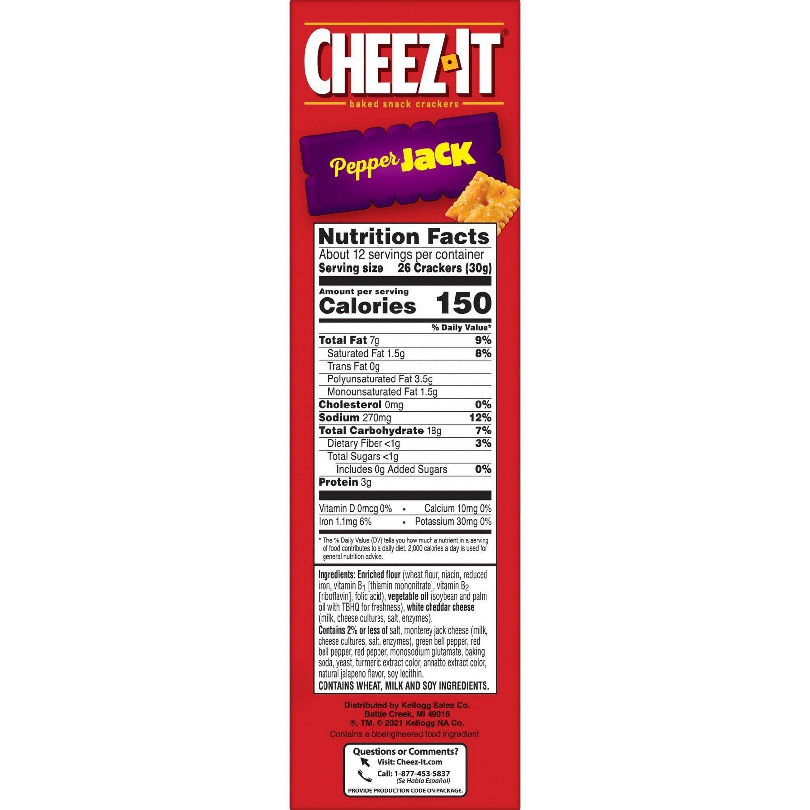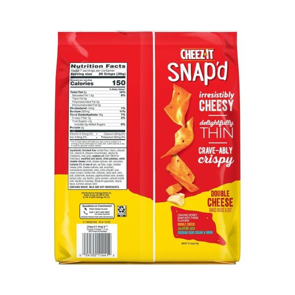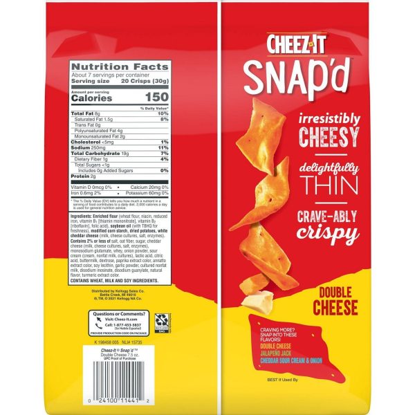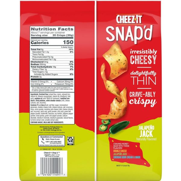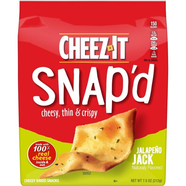 u0026bull;Thin and crispy cheesy baked snacks made with the irresistible flavor combination of real cheese and spicy jalapeñou003cbru003eu0026bull;Turn up the cheese volume with the satisfying crunch of Cheez-It Snap’du003cbru003eu0026bull;Made with 100% real cheese; Kosher dairy, contains wheat, milk and soy ingredientsu003cbru003eu0026bull;An anytime snack that makes a tasty bite at home or on the go; Enjoy while relaxing and watching TV, or add as a crunchy side to your sandwichu003cbru003eu0026bull;Includes 1, 7.5-ounce bag of ready-to-eat cheesy baked snacks; Packaged for freshness and great taste