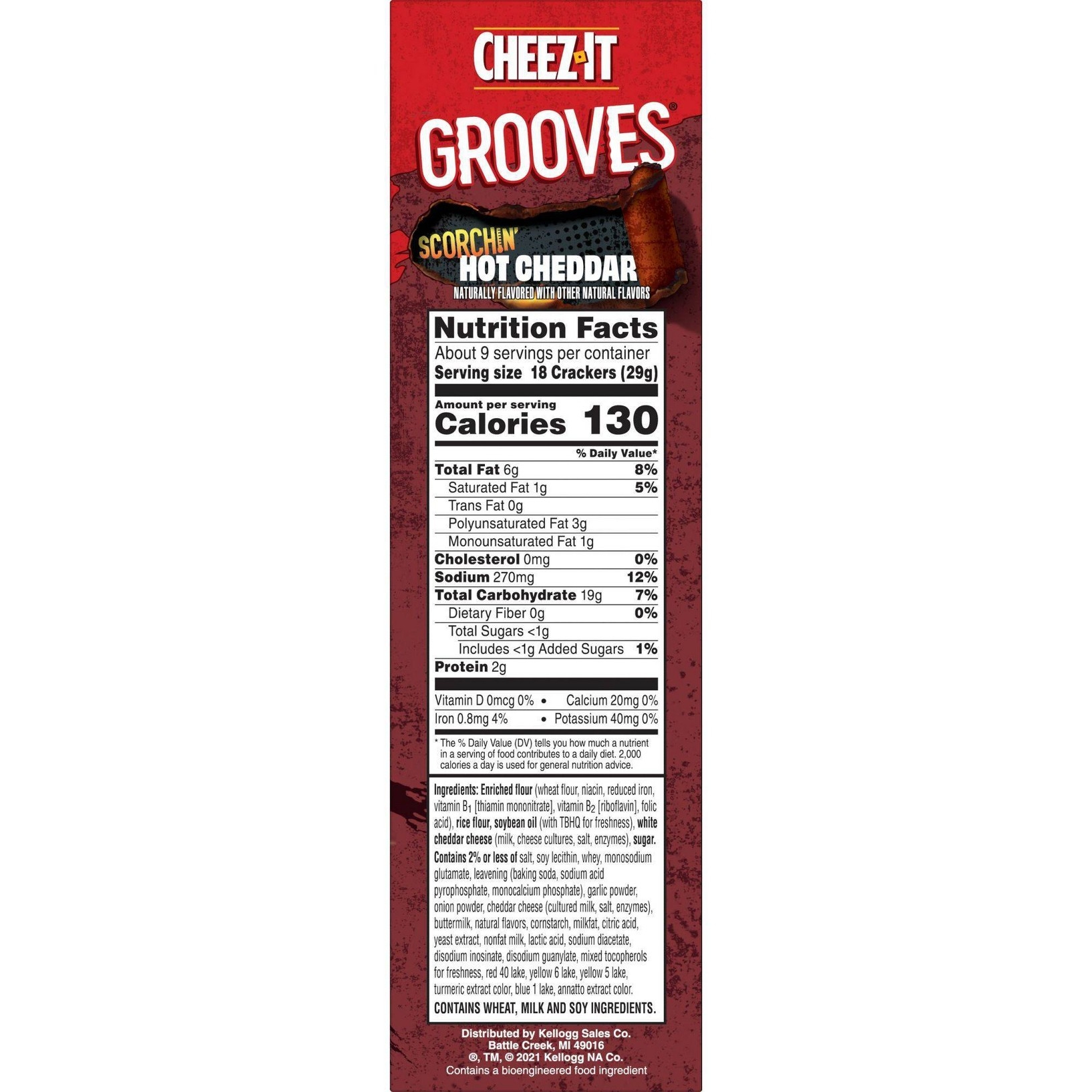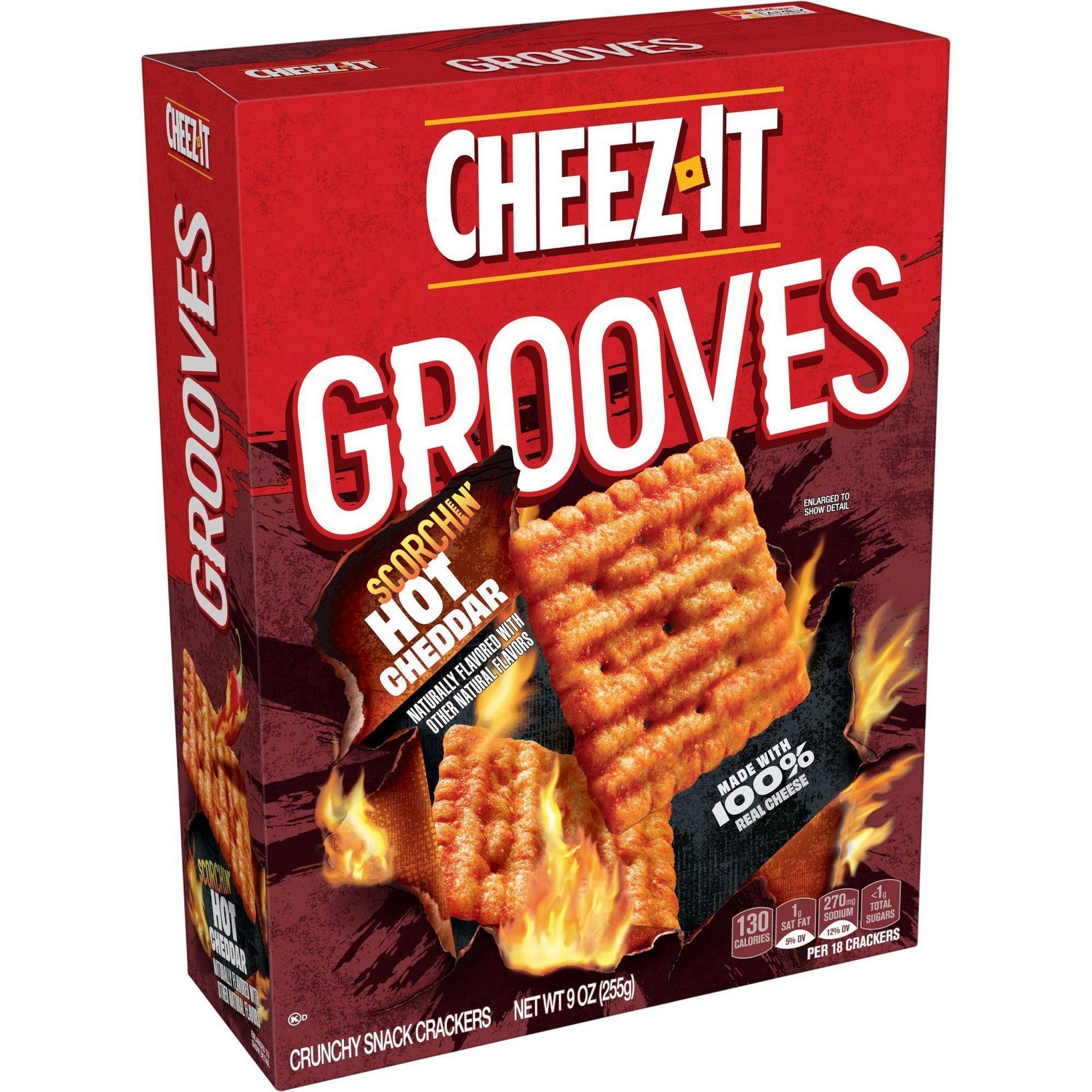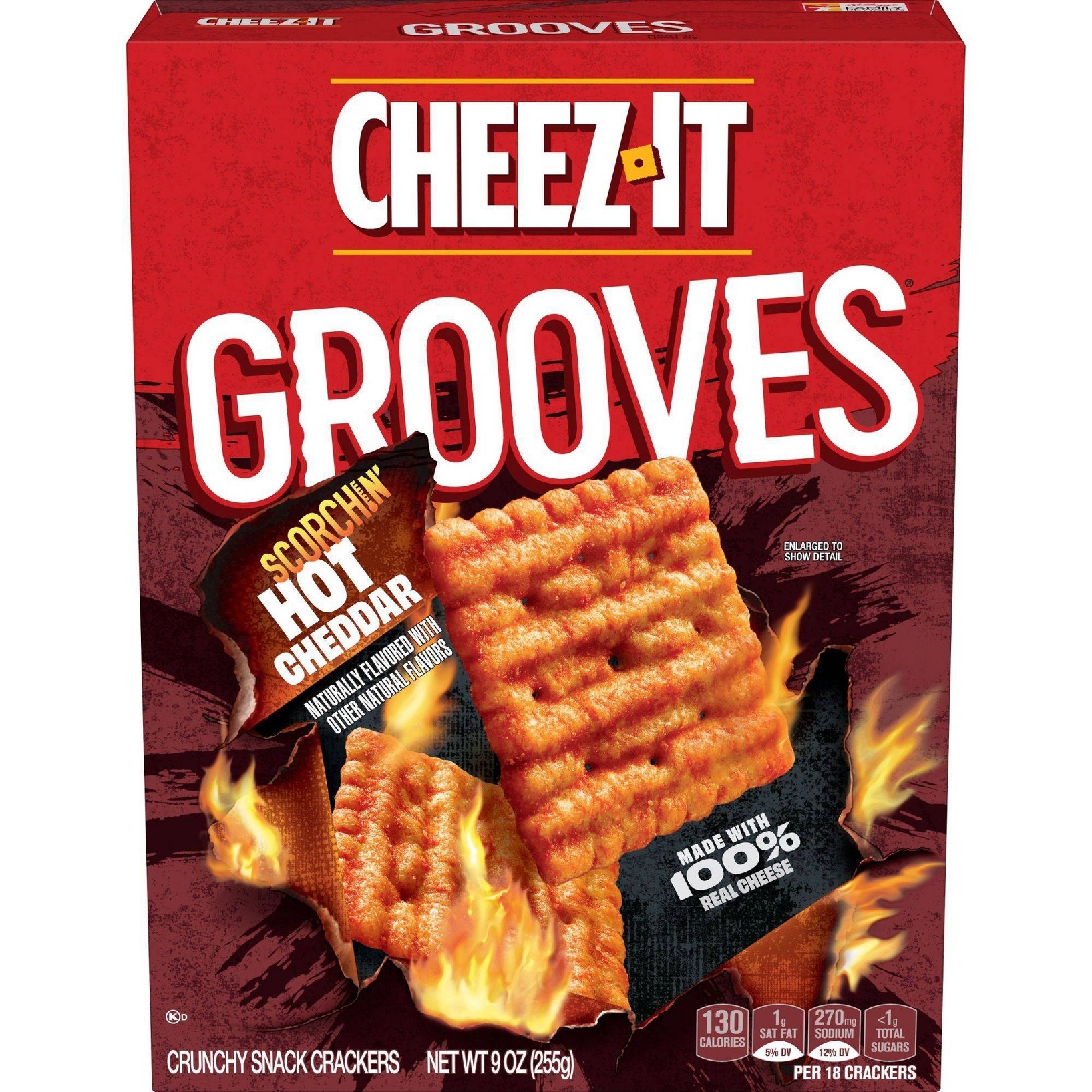 u0026bull;Enjoy the bold, hot and cheesy flavor and the big crunch of these thin, ridged crackersu003cbru003eu0026bull;Cheez-It Grooves are baked, crunchy, and made with 100% real cheese that’s been aged for an irresistibly cheesy tasteu003cbru003eu0026bull;The perfect snack anytime; Satisfy your afternoon cravings at the office; Enjoy as a quick bite after school; Level up your snacking while gaming with friendsu003cbru003eu0026bull;Contains wheat, milk, and soy ingredients; Kosher Dairyu003cbru003eu0026bull;Includes 1, 9-ounce box of ready-to-eat crunchy snack crackers; Packaged for freshness and great taste