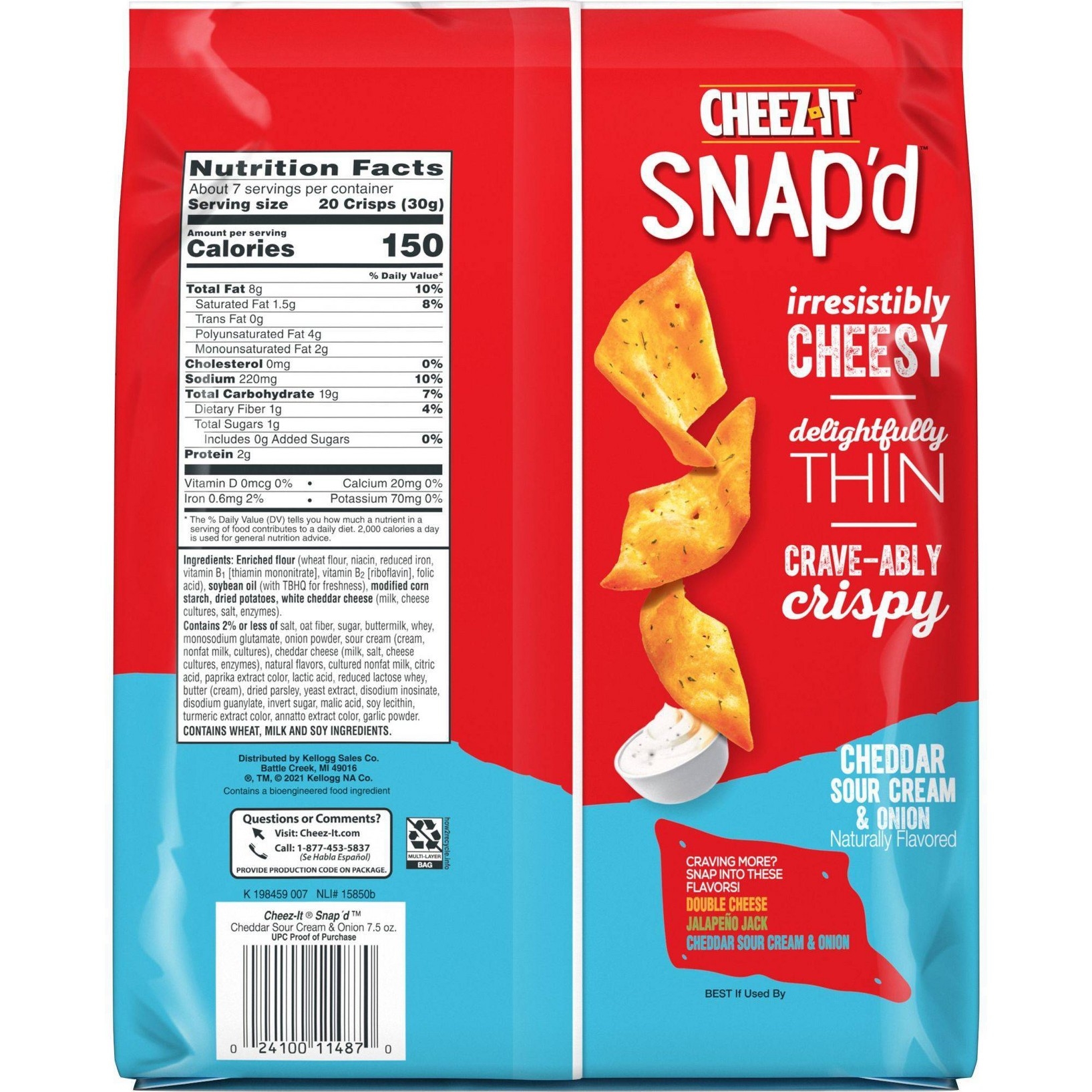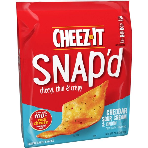 u0026bull;Thin and crispy cheesy baked snacks made with the irresistible flavor combination of cheddar, sour cream, and onionu003cbru003eu0026bull;Turn up the cheese volume with the satisfying crunch of Cheez-It Snap’du003cbru003eu0026bull;Made with 100% real cheese; Kosher dairy, contains wheat, milk and soy ingredientsu003cbru003eu0026bull;An anytime snack that makes a tasty bite at home or on the go; Enjoy while relaxing and watching TV, or add as a crunchy side to your sandwichu003cbru003eu0026bull;Includes 1, 7.5-ounce bag of ready-to-eat cheesy baked snacks; Packaged for freshness and great taste