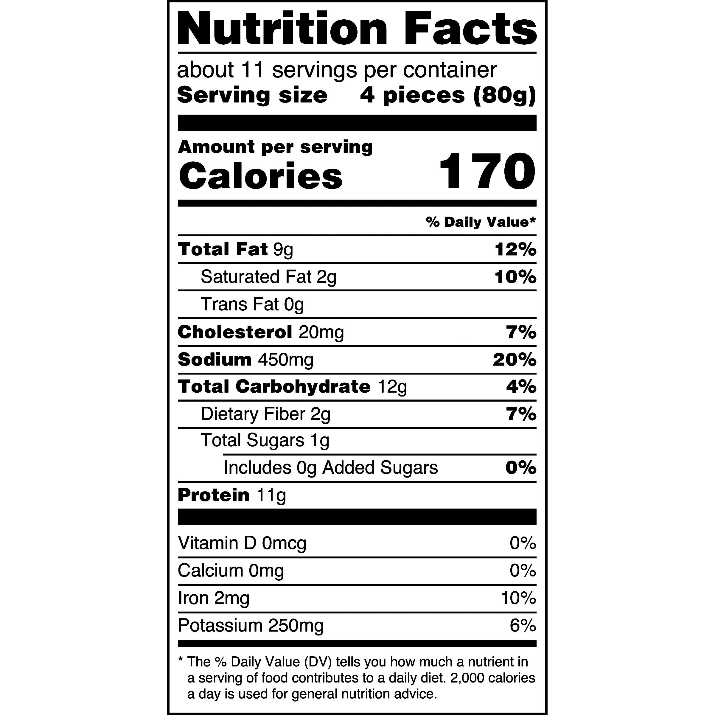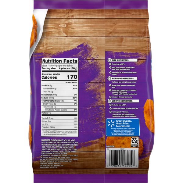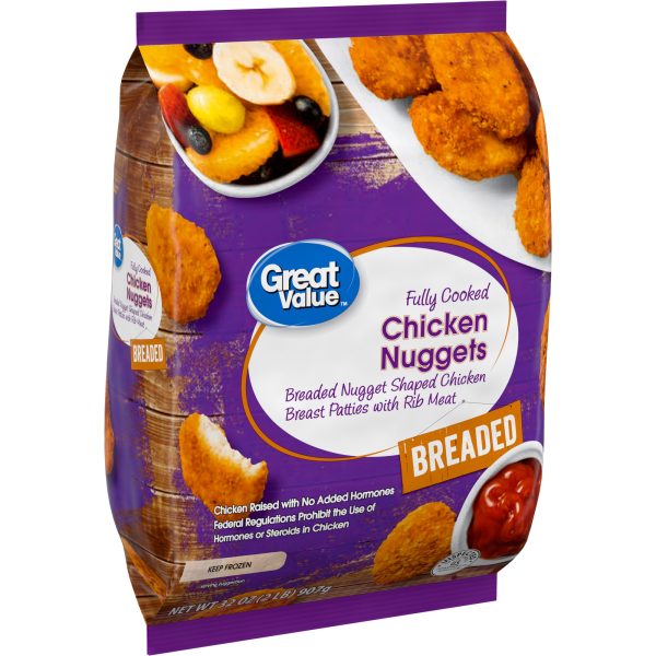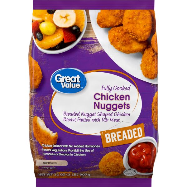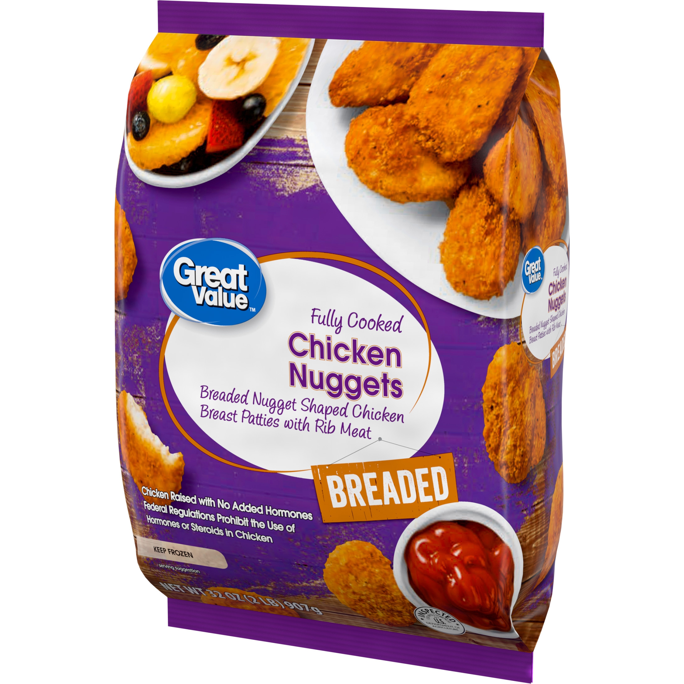 Enjoy a delicious, quick meal with Great Value Chicken Nuggets. Made with boneless chicken breast seasoned and breaded to perfection, these chicken breast patties provide 11 grams of protein per serving. Easy to prepare from frozen in the oven or air fryer, these fully cooked chicken nuggets are perfect for finger foods kids can enjoy or a great late night snack your whole family will love. For a savory appetizer, prepare and serve with your favorite dipping sauces. Includes one 32 oz package of chicken nuggets.