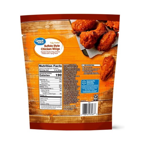 Impress family and friends alike at your next gathering with Great Value Buffalo Style Seasoned Boneless Fully Cooked Breaded Chicken Wyngz. These fully cooked chicken wings are a great tasting, quick, and convenient meal for the entire family. Breaded and covered in a spicy and savory buffalo style seasoning, these delicious chicken wings contain eleven grams of protein per serving. A perfect weekday meal with family or as an appetizer for a weekend gathering, these fully cooked frozen chicken wings are easy to prepare. Simply place in an oven, air fryer or microwave until hot. Includes one 24 ounce package of Great Value Buffalo Style Seasoned Boneless Fully Cooked Breaded Chicken Wyngz.