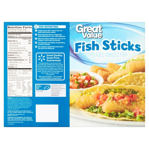 Bite into perfectly seasoned Great Value Breaded Fish Sticks for a delicious finger food meal. Our yummy fish sticks are made with sustainably-sourced Alaska Pollock, making them a wholesome and responsible choice. Easily prepare these fish sticks in the oven to a golden brown with a crispy exterior. Pair them with tartar sauce and a vegetable like sauteed broccoli or roasted carrots for a well-rounded weeknight dinner. Great Value Breaded Fish Sticks are an excellent choice for your next meal.