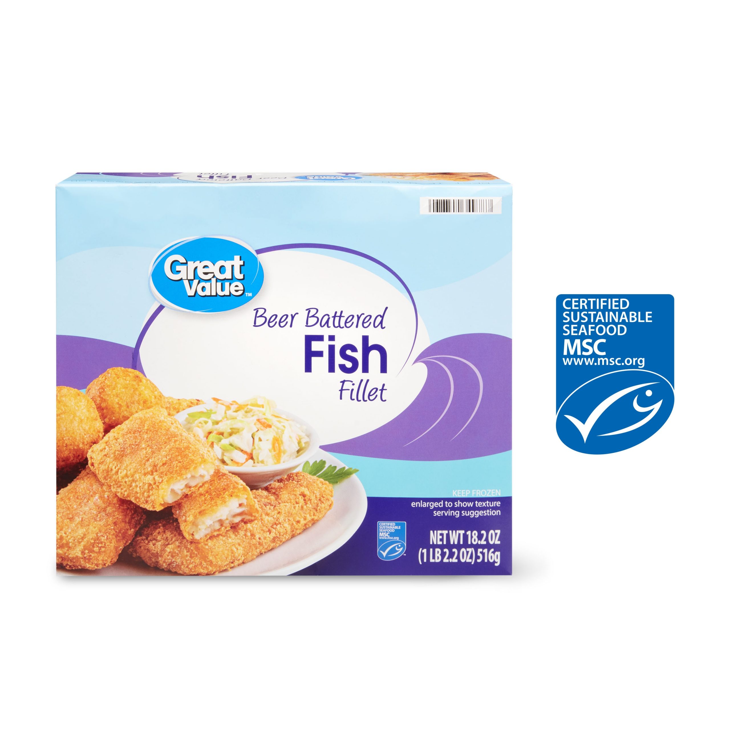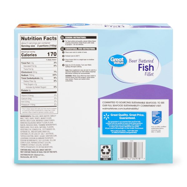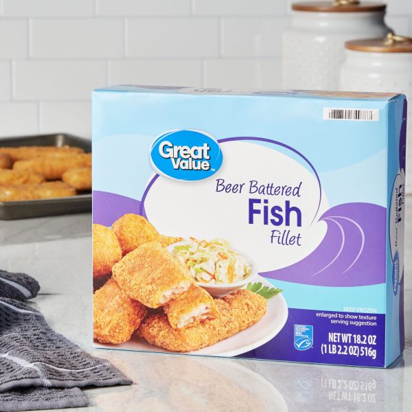 Our Great Value Beer Battered Fish Fillets are the perfect quick and easy dinner for a busy weekday evening. These delicious Great Value Beer Battered Fish Fillets are an excellent centerpiece for when you need a yummy and healthy dinner in a snap. Best of all, these fillets are made with MSC-certified sustainable pollock. They go great with any of your family’s favorite sides from a fresh chopped salad and veggies to mac and cheese and mashed potatoes. Easy-to-follow cooking instructions for the oven are provided right on the box to make dinner preparation a breeze. Enjoy the delicious taste of our Great Value Beer Battered Fish Fillets for dinner tonight!