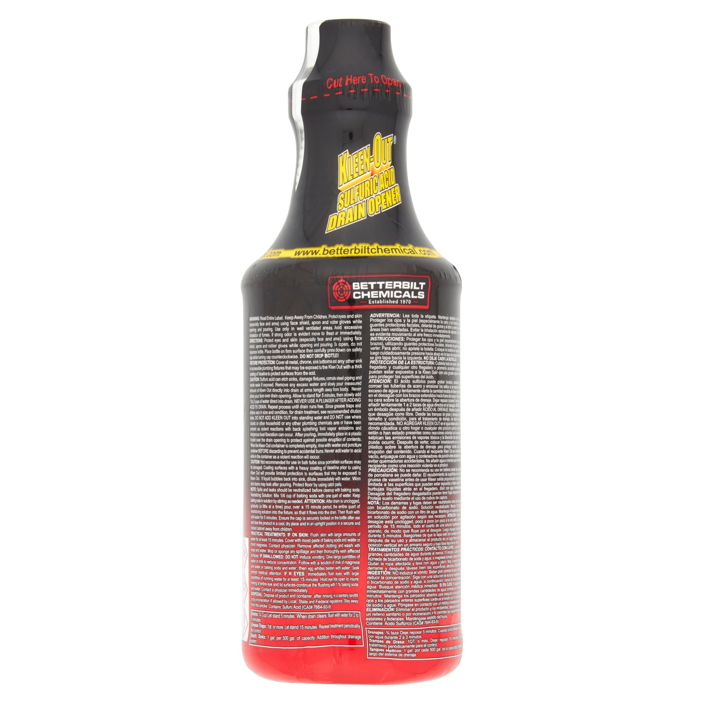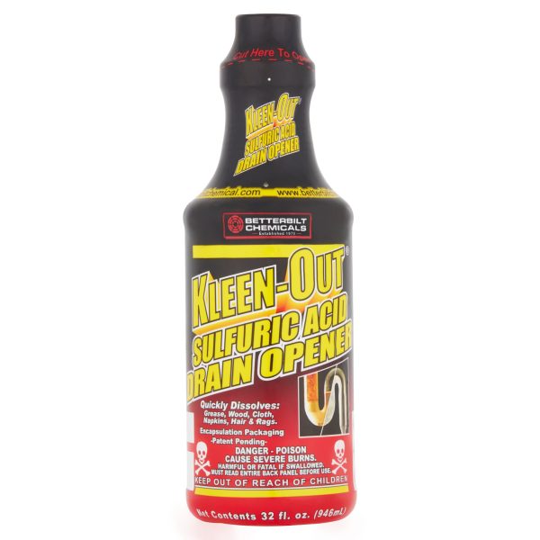 Betterbilt Chemical Kleen-Out Sulfuric Acid Drain Opener. Quickly dissolves grease, wood, cloth, napkins, hair, and rags. Kleen-Out Sulfuric Acid Drain Opener contains significantly inhibited sulfuric acid emulsion for enhanced penetration. Kleen-out drain cleaner is safe to use in most piping. It comes with crystal-clear instructions to properly guide you. Always use slowly and only add into flowing water. Safe for most piping systems and septic tanks.