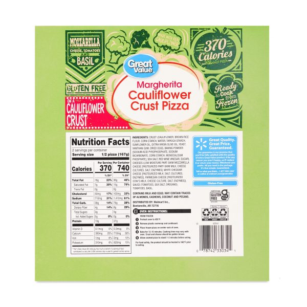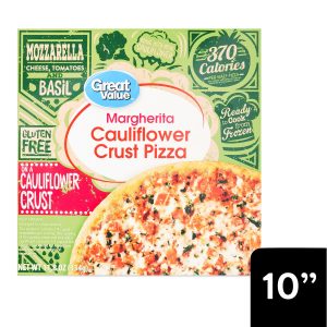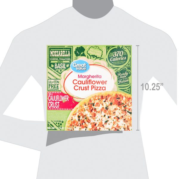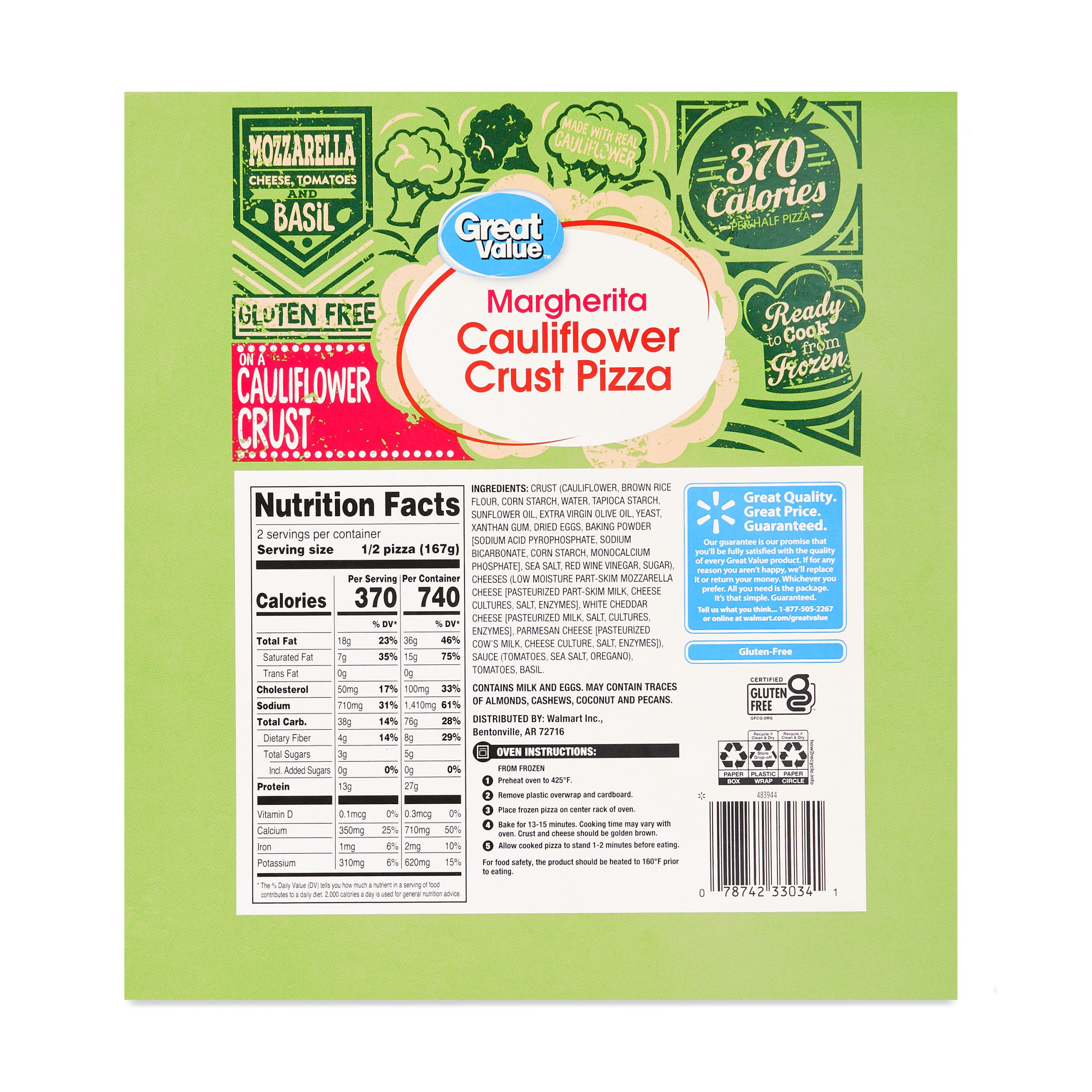 Now you can have great-tasting pizza that is actually good for you without sacrificing taste or skimping on ingredients. Our Great Value Margherita Pizza uses a cauliflower crust which is delicious. It starts with our vegetable crust: The cauliflower crust delivers a flavorful, satisfying crunch while still being light and airy. Only the finest, high quality ingredients: real cheddar cheese, and creamy mozzarella, zesty parmesan, hearty refreshing tomatoes, with a hint of basil, all on a sauce that’s rich, tangy and perfectly seasoned. Best yet, our cheeses are all real and rBST free. It’s better for you that doesn’t taste like better for you. Our cauliflower crust pizzas are gluten-free and never have any artificial colors.