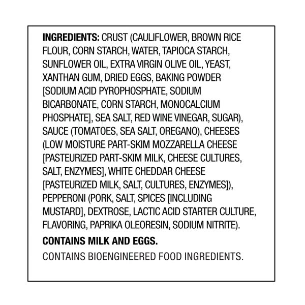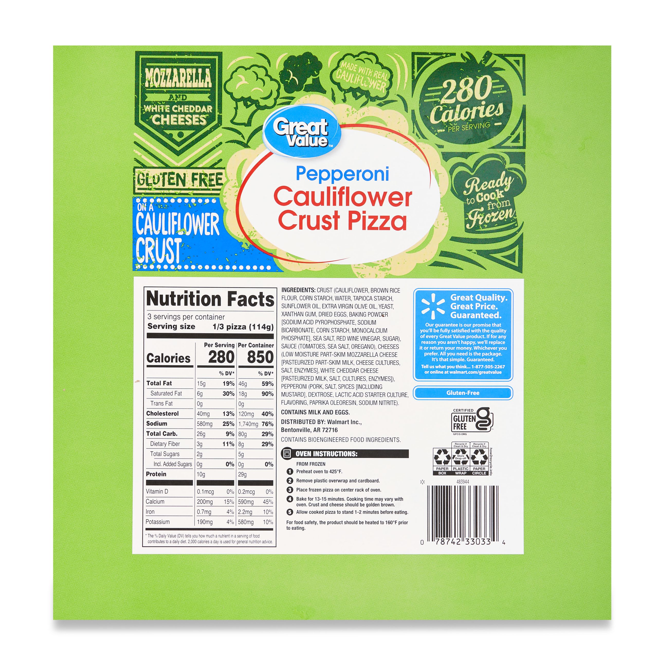 Our Great Value Pepperoni Cauliflower Crust Pizza is a perfect choice for when you’re in the mood for pizza but your diet is calling for a gluten-free alternative. Now you can have great-tasting pizza with a real vegetable-based cauliflower crust and all that traditional pizza flavor you love. It starts with our vegetable crust: the cauliflower crust delivers a flavorful, satisfying crunch while still maintaining a light and airy texture. Then, there are only the finest, high-quality ingredients: pepperoni that’s spicy but not too spicy, real cheddar cheese, and creamy mozzarella, with a sauce that’s rich, tangy, and perfectly seasoned. It’s better for you that doesn’t taste like better for you. Enjoy a classic meal sans the gluten with our Great Value Pepperoni Cauliflower Crust Pizza.