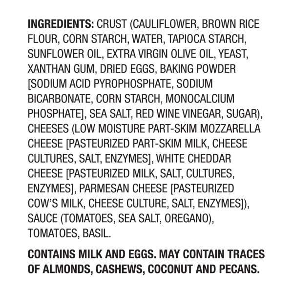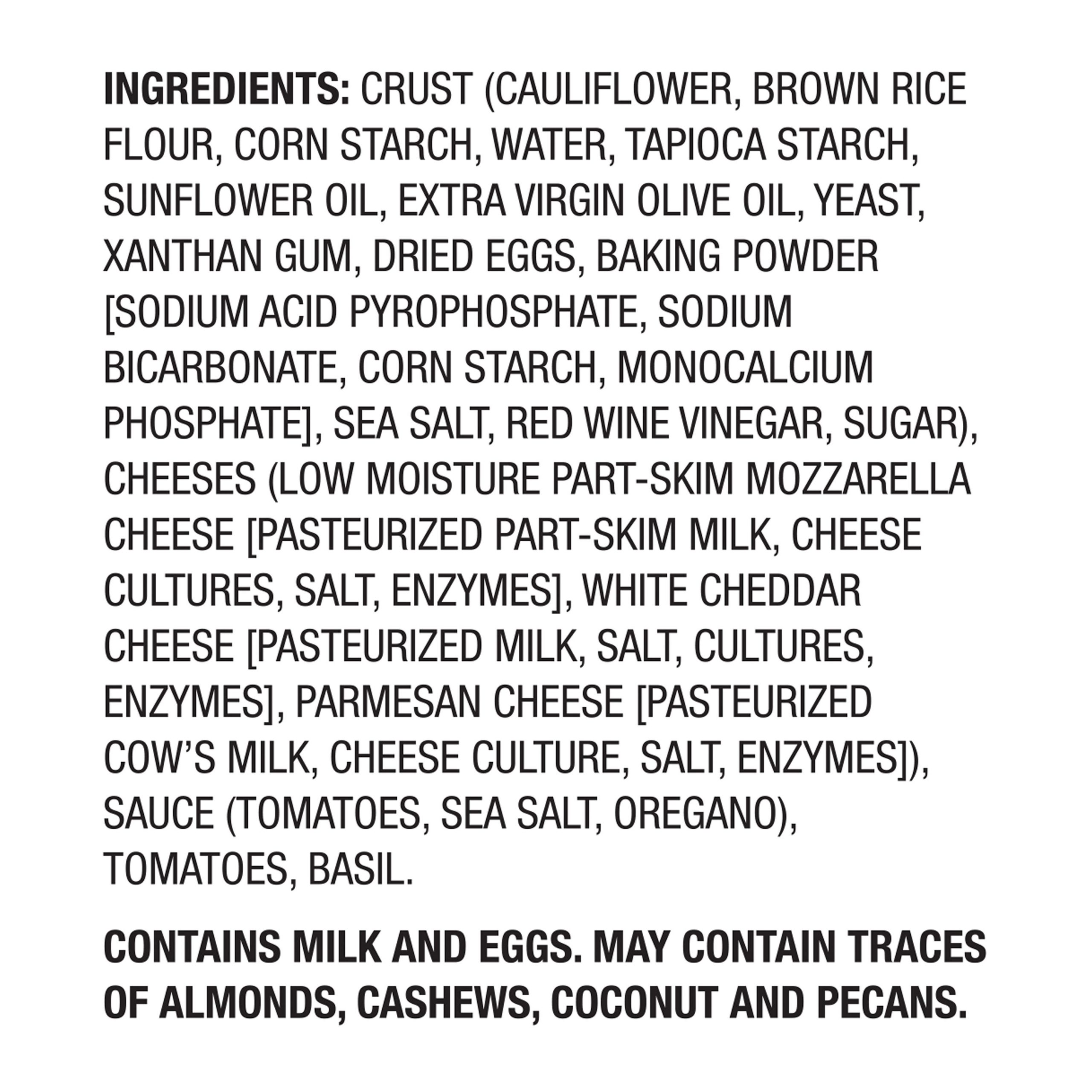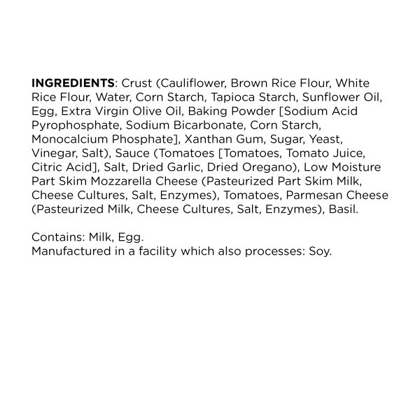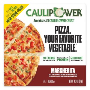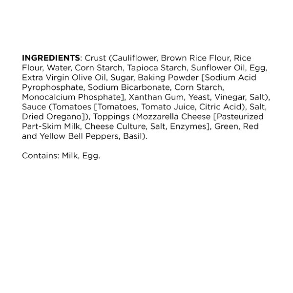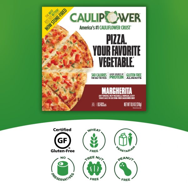 CAULIPOWER? uses the power of veggies to make healthier, easier versions of the food you crave, that actually TASTE like the food you crave. The BEST just got BETTER: America’s #1 cauliflower crust pizza is NOW STONE-FIRED and crispier than ever! Our Margherita Pizza is a nutritious spin on a classic fave, using our delicious crust that’s made with real cauliflower as the base, and topping it with vine-ripened tomatoes and a melty mix of mozzarella and parmesan cheese. It’s tasty, crispy, ?WHOA! THIS IS MADE WITH CAULIFLOWER CRUST?!? pizza.