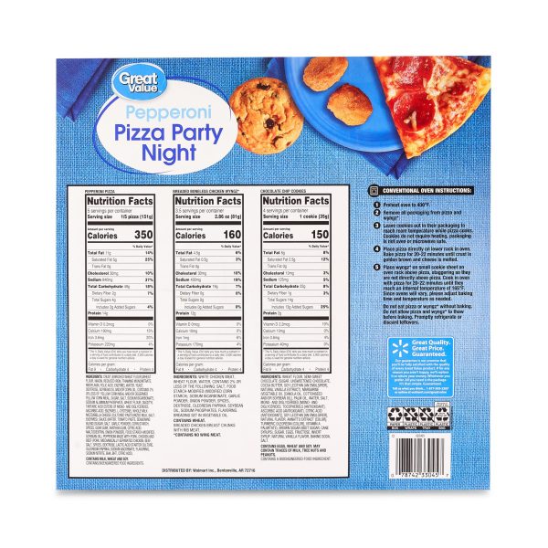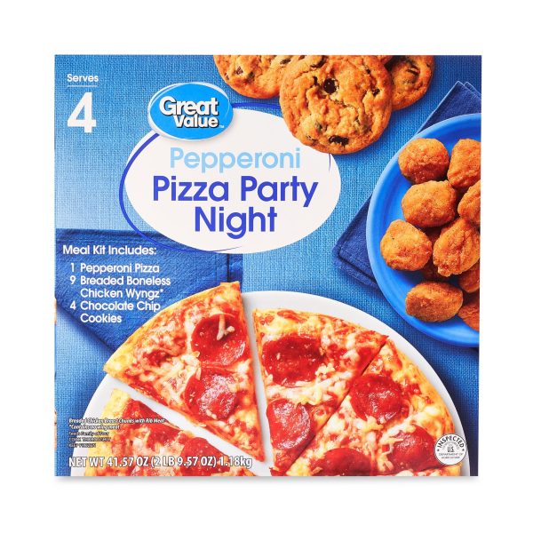 Stop hunger in its tracks with the Great Value Pepperoni Pizza Party Night Meal Kit! This fun meal kit includes one pepperoni pizza, nine breaded boneless chicken wyngz,* and four chocolate chip cookies- perfect for a family movie night or game night at home. You may want to add a side of ranch for dipping the wyngz,* the Great Value Pepperoni Pizza Party Night Meal Kit is just the ticket.