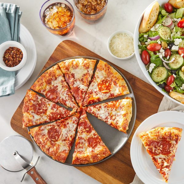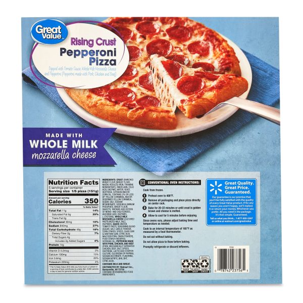 Stop hunger in its tracks with Great Value Rising Crust Pepperoni Pizza. This filling pizza can serve up to five people and features a mouthful of tasty toppings including tomato sauce, whole milk Mozzarella cheese, and pepperoni. You may want to add a side of garlic butter or marinara sauce for dipping the delicious crust after you’ve devoured the rest of your slice! When your hunger calls for a pizza with serious toppings, Great Value Rising Crust Pepperoni Pizza is just what you need.