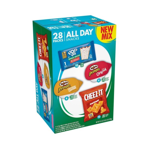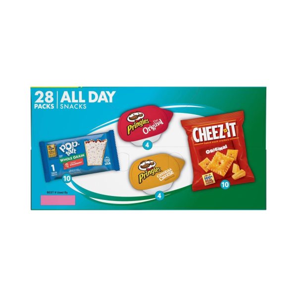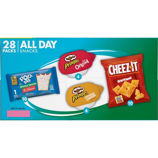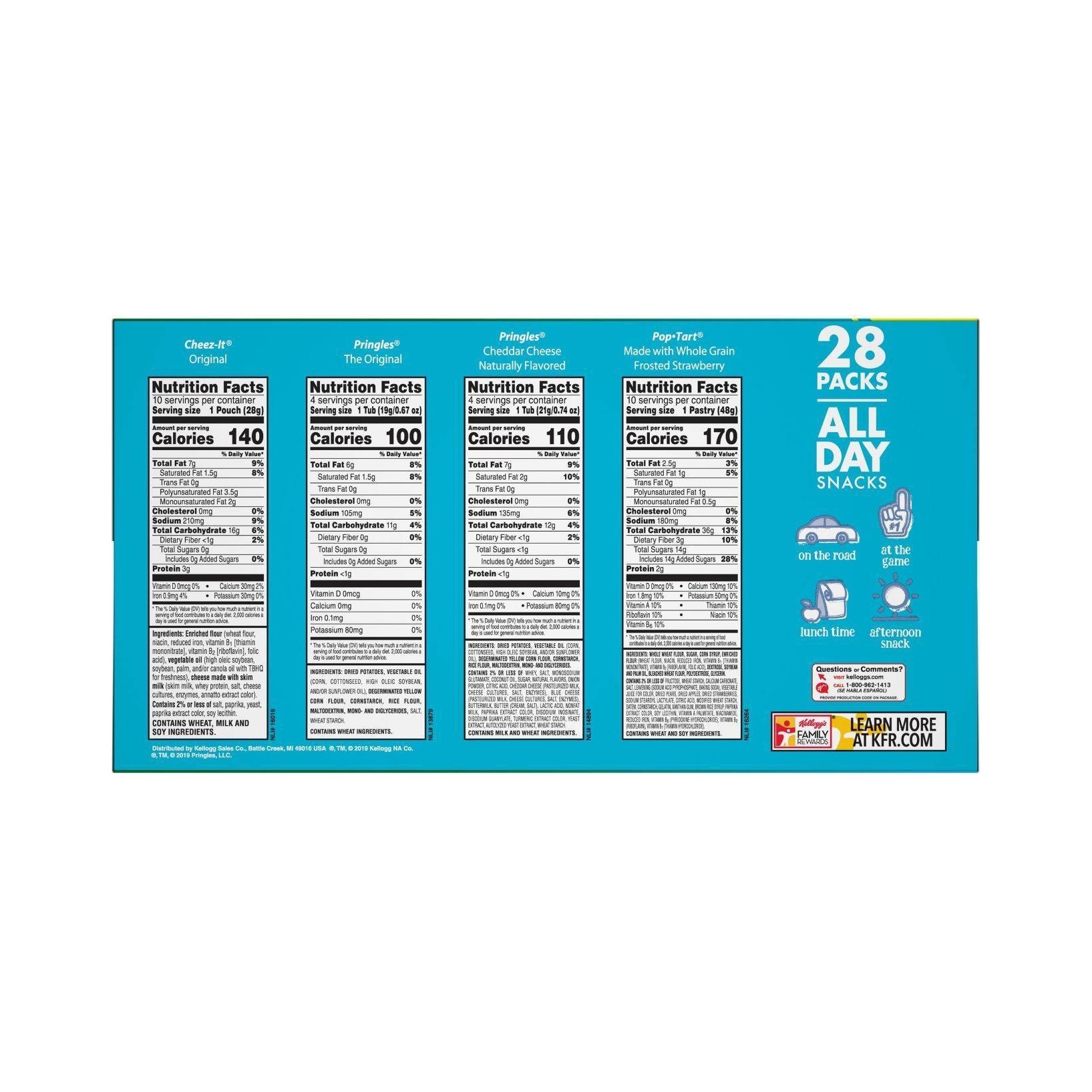 u0026bull;Satisfy any sweet, salty, or cheesy craving with this variety pack featuring four choices of conveniently packaged, family-favorite snacksu003cbru003eu0026bull;Take your pick of Cheez-It Original Baked Snack Crackers, Pop-Tarts Made with Whole Grain Frosted Strawberry Toaster Pastries, Pringles Cheddar Cheese Potato Crisps, and Pringles Original Potato Crispsu003cbru003eu0026bull;Variety pack contains wheat, milk, and soy ingredientsu003cbru003eu0026bull;Perfect for quick snacks at home, work, school or on-the-go; A box of easy snacks the whole family can enjoyu003cbru003eu0026bull;Includes 1, 32.5-ounce caddy, containing 10 pouches of Cheez-It Original Baked Snack Crackers, 10 pouches of Pop-Tart Whole Grain Frosted Strawberry, 4 Pringles Cheddar Cheese Snack Stacks, and 4 Pringles Original Snack Stacks