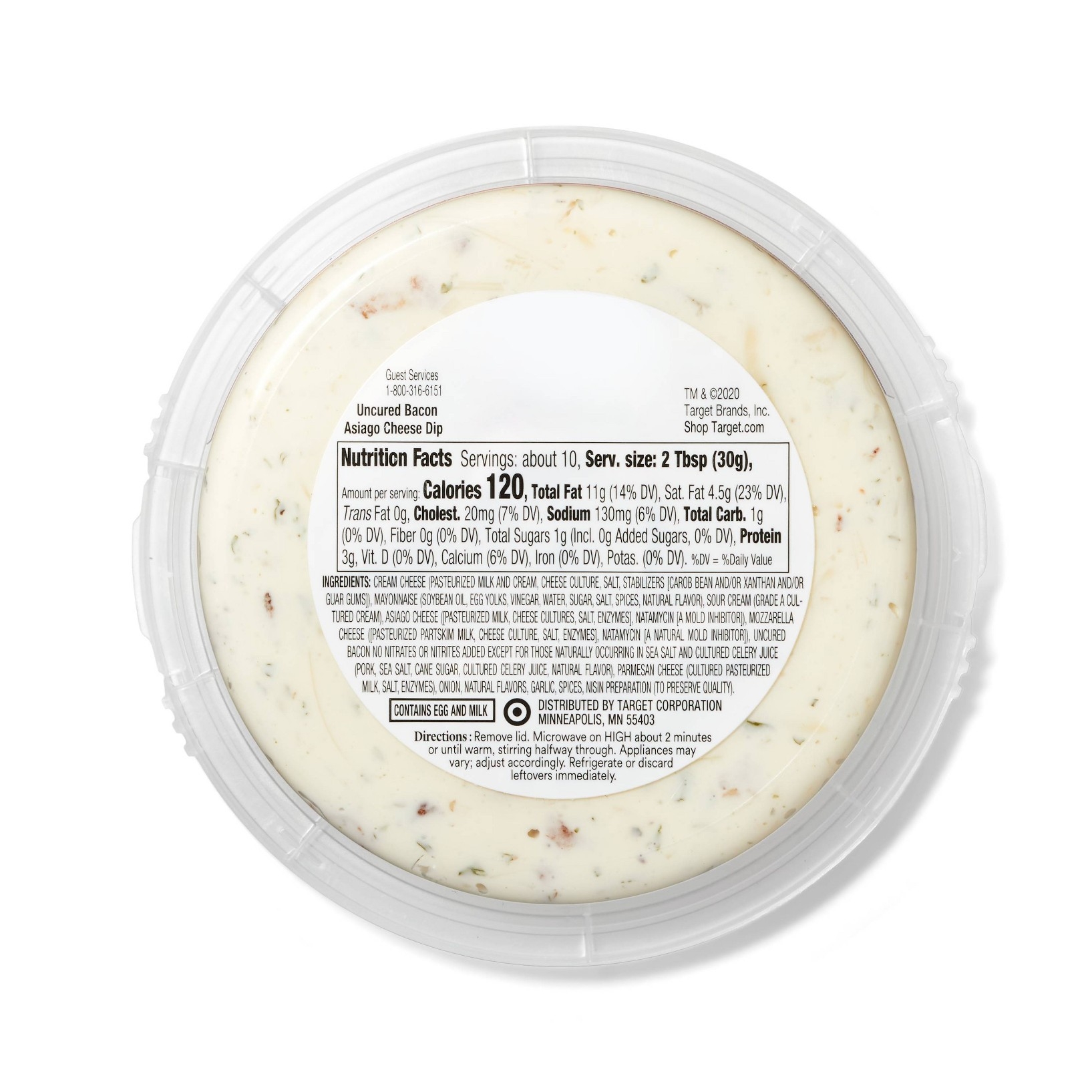 u0026bull;Savory dip made with cream cheese, Asiago cheese, mozzarella cheese and uncured baconu003cbru003eu0026bull;Made with no artificial preservatives, synthetic colors or artificial flavorsu003cbru003eu0026bull;Convenient packaging allows for easy servingu003cbru003eu0026bull;Delicious with veggies, pretzels, pita chips, flatbread and more