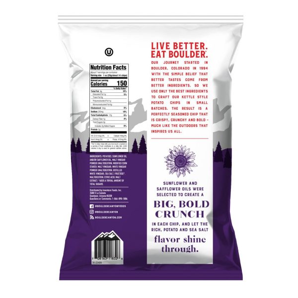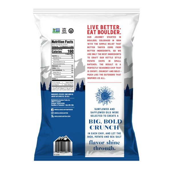 u0026bull;Sunflower and safflower oils were selected to create a big, bold, crunch, in each chip and let the rich potato and sea salt flavor shine throughu003cbru003eu0026bull;Find your path: Our path took us to the great outdoors. Our thick cut, kettle-cooked potato chips have a lot in common with nature-crisp, crunchy, bold, real. Wherever your path takes you, bring Boulder Canyon with you.