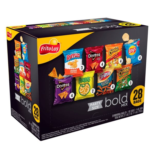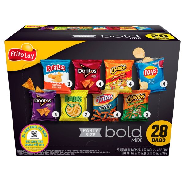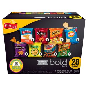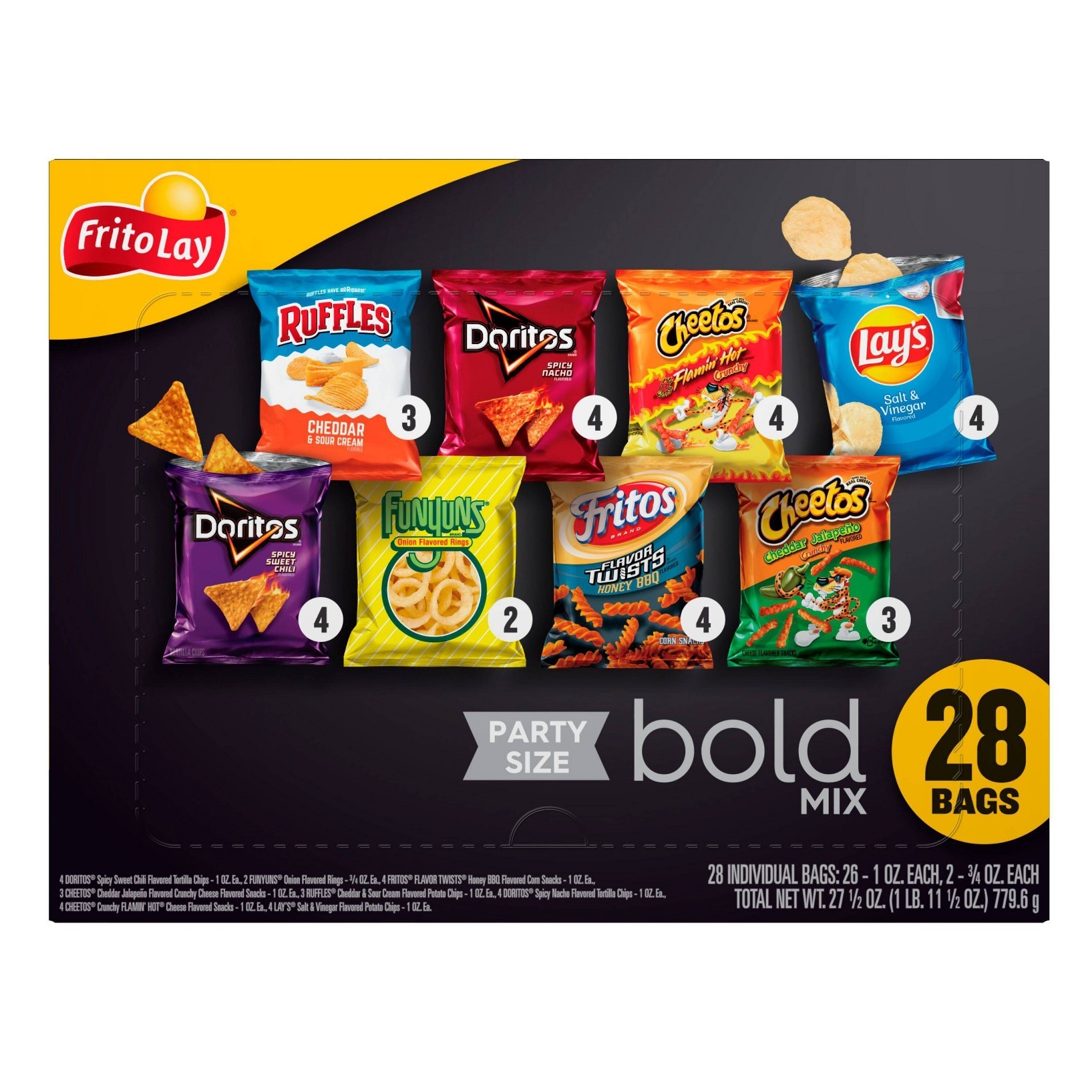 u0026bull;28 count mix includes Lay’s Salt u0026 Vinegar Potato Chips, Ruffles Cheddar u0026 Sour Cream Potato Chips, Fritos Flavor Twists Honey BBQ, Doritos Spicy Sweet Chili Tortilla Chips, Funyuns Onion Flavored Rings, Cheetos Flamin’ Hot Crunchy, Cheetos Cheddar Jalapeno Crunchy and Doritos Spicy Nacho Tortilla Chipsu003cbru003eu0026bull;You’ll have at least one of each item featured on the packaging, but due to unprecedented supply chain challenges the exact mix will vary.u003cbru003eu0026bull;All your faves are here! But some item counts will varyu003cbru003eu0026bull;Great snacks your whole family will enjoyu003cbru003eu0026bull;Individually packaged for easy on-the-go and flavor-filled snackingu003cbru003eu0026bull;Perfect for packing lunchesu003cbru003eu0026bull;Packaging may vary