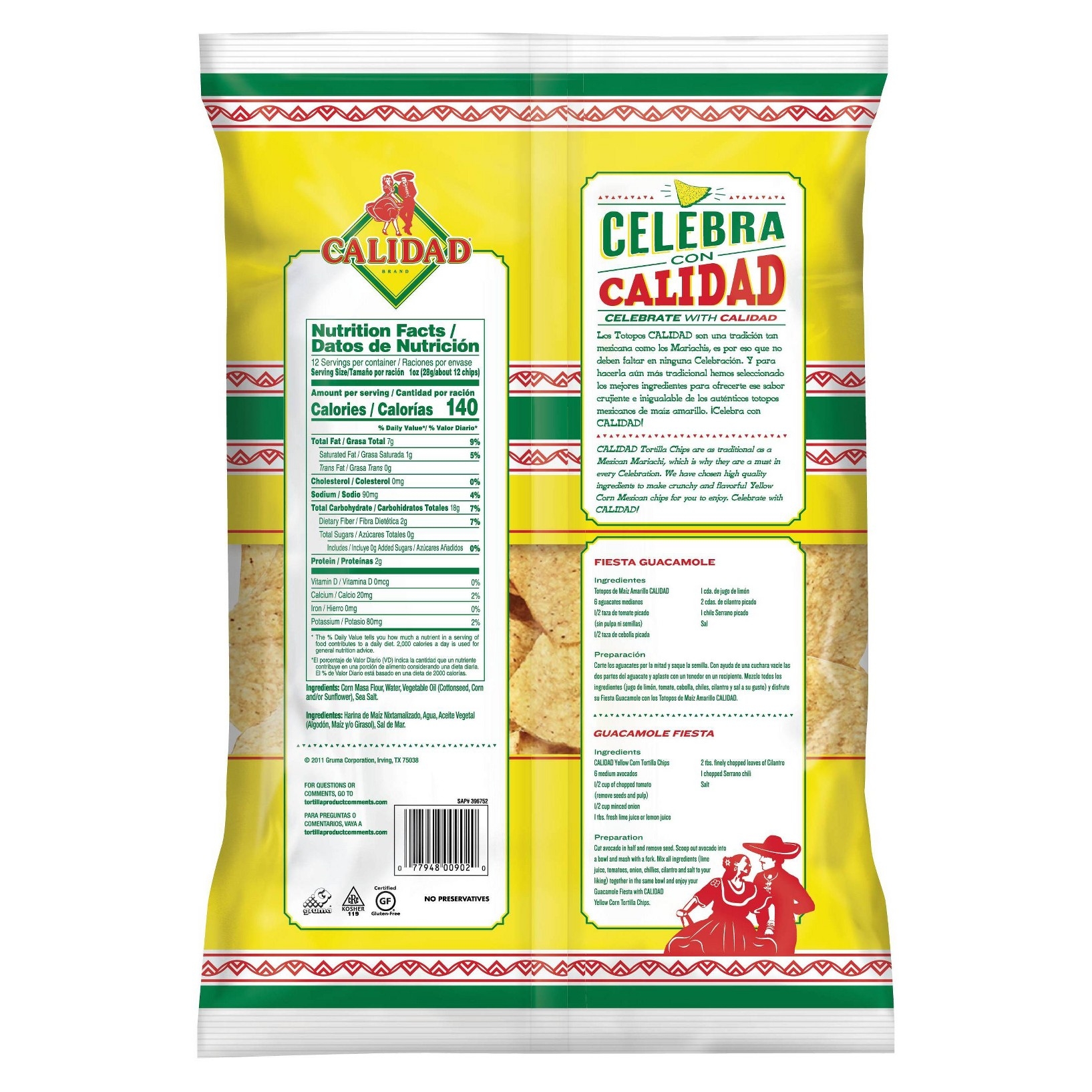 u0026bull;One 28oz bag of Calidad Yellow Corn Tortilla Chipsu003cbru003eu0026bull;Made with traditional ingredients and cooking methodsu003cbru003eu0026bull;0g of trans fats per servingu003cbru003eu0026bull;Certified gluten freeu003cbru003eu0026bull;Perfect for any authentic Mexican recipe