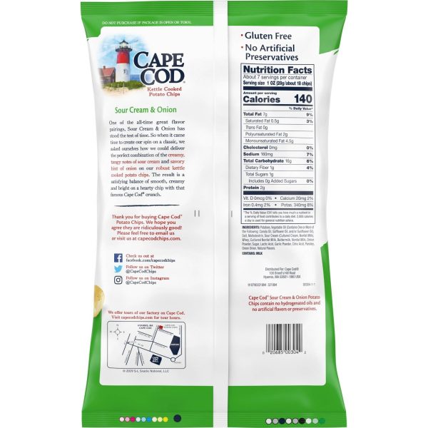 u0026bull;PERFECT FLAVOR COMBINATION: Tangy sour cream and savory onion on Cape Cod potato chipsu003cbru003eu0026bull;KETTLE-COOKED POTATO CHIPS: Made one small batch at a time, with unique shapes and folds for one-of-a-kind chipsu003cbru003eu0026bull;QUALITY INGREDIENTS: Potato chips with no artificial flavors, colors, or preservativesu003cbru003eu0026bull;GLUTEN-FREE: These kettle cooked chips are gluten-free; do contain milku003cbru003eu0026bull;ROBUST FLAVOR: Enjoy a 7.5-ounce bag of remarkable taste and that wonderful Cape Cod crunch