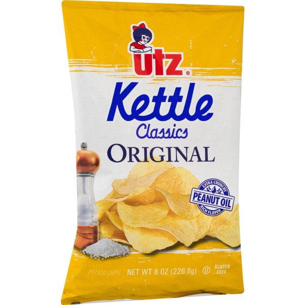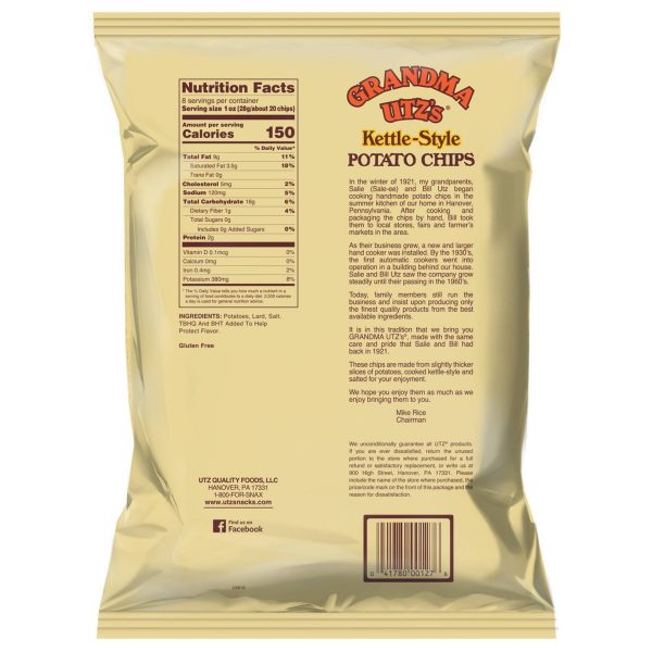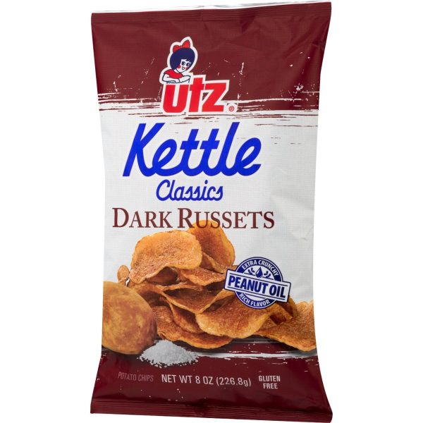 u0026bull;The Utz Kettle Classics Dark Russets Potato Chips are made from fresh potatoes and are cooked in 100% pure peanut oil until they are perfectly crispy. This extra thick cut, crunchy potato chips is topped off with just the right amount of salt to make this your satisfying go-to snack.u003cbru003eu0026bull;Multiple serving size with 8 servings. Perfect for snacking right out of the bag and keeping handy for whenever the cravings strike.u003cbru003eu0026bull;Enjoy these delicious, crunchy potato chips without the guilt. They are cooked without preservatives or hydrogenated oils and are gluten, cholesterol and trans-fat free. Kosher certified.u003cbru003eu0026bull;Since 1921, Utz has been making and selling quality pretzels and other delicious snacks in Hanover, PA, the snack capital of the world! We’re a family-managed business providing snacks that are crunchier, lighter, fresher and simply better.