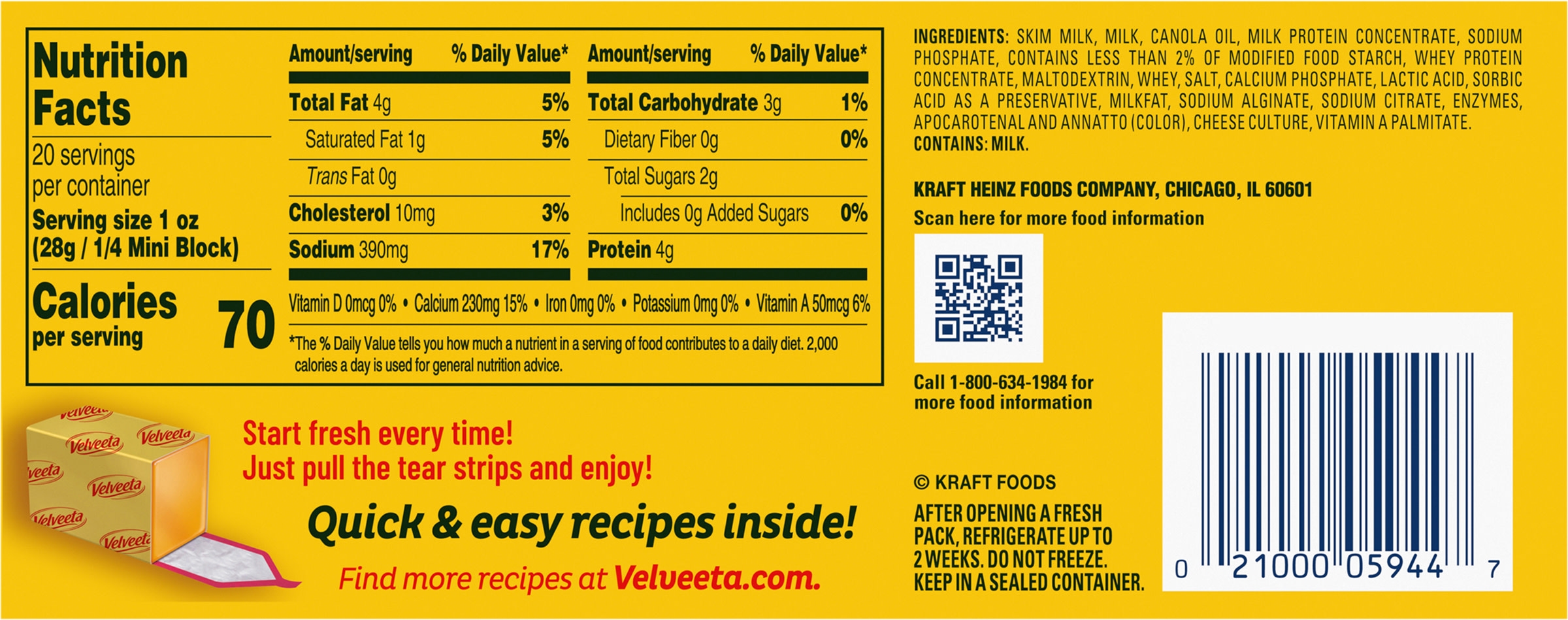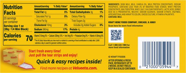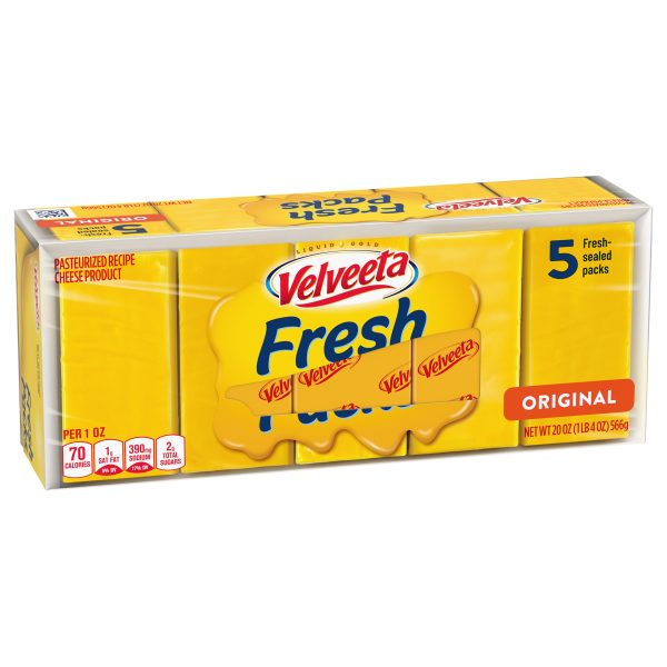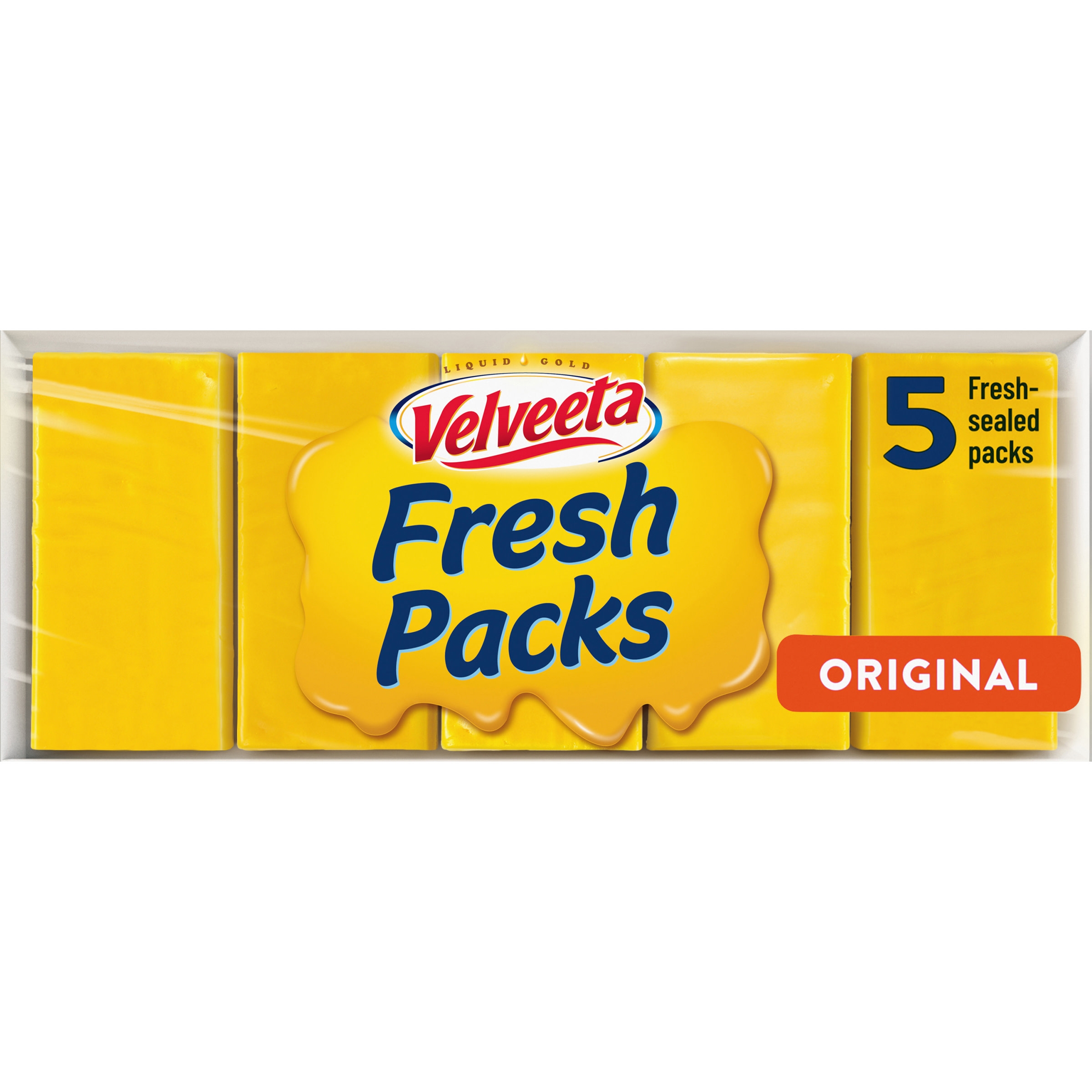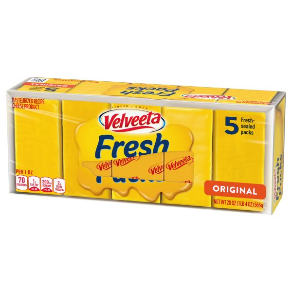 Velveeta Fresh Packs deliver that unmistakable creamy melt you love anytime, anywhere. You get the original flavor of Velveeta cheese, made with milk for a rich dairy texture and flavor. Each fresh pack is perfectly portioned to enhance any recipe, whether you’re topping a baked potato, adding some velvety deliciousness to tacos or stuffing meatballs. This original Velveeta is just as versatile when melted, letting you make cheese dip or for social gatherings, broccoli and cheese for a midday snack or cheesy pasta sauce for dinnertime. Each 20 ounce box contains 5 individually wrapped cheese blocks for freshness, and easy-open tear strips offer meal prep convenience.