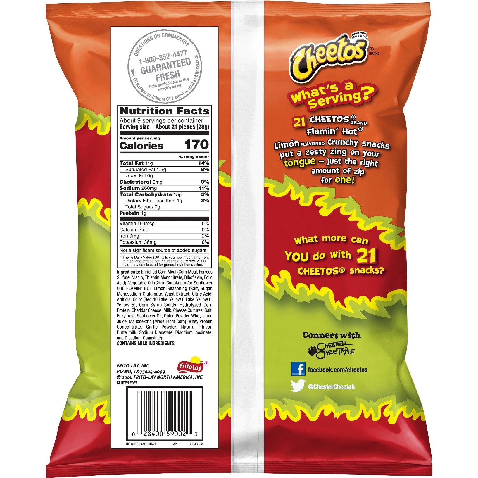 u0026bull;Includes 1 (8.5oz) bag of Cheetos Flamin’ Hot Limon Crunchy Cheddar Cheese Snacksu003cbru003eu0026bull;Limon crunchy snacks put a zesty zing on your tongueu003cbru003eu0026bull;Made with real cheeseu003cbru003eu0026bull;They’re finger lickin’ good- add some cheesy smiles to your next gathering with this shareable bagu003cbru003eu0026bull;Try packing about 21 cheetos crunchy snacks for your next work or school lunch- that’s just the right amount for fun to the max!