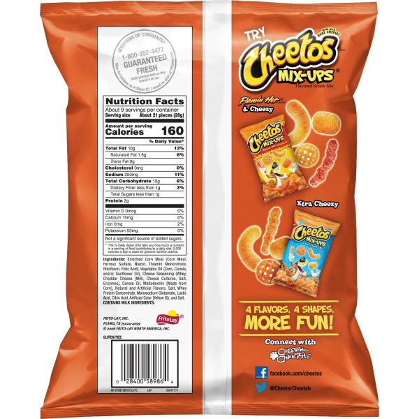 u0026bull;Bring a cheesy, delicious crunch to snack time with a bag of CHEETOS Cheese-Flavored Snacksu003cbru003eu0026bull;Made with real cheese for maximum flavoru003cbru003eu0026bull;CHEETOS snacks are the much-loved cheesy treats that are fun for everyoneu003cbru003eu0026bull;Wherever the CHEETOS brand and CHESTER CHEETAH go, cheesy smiles are sure to follow