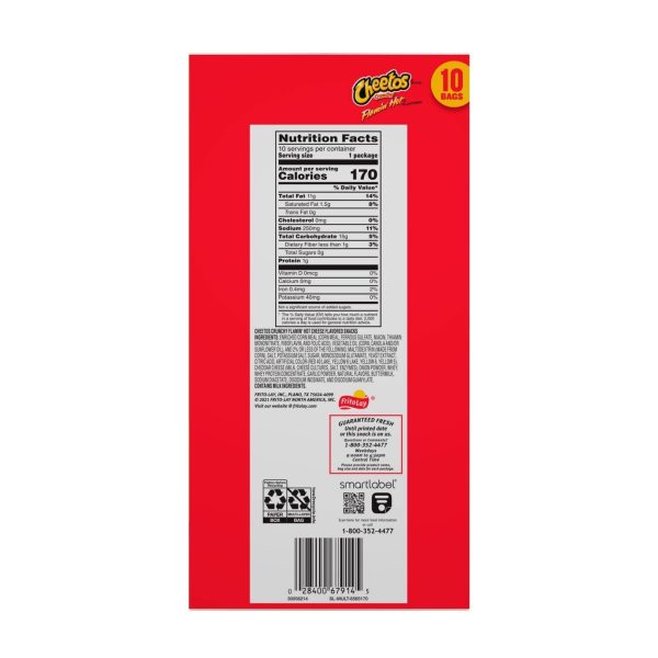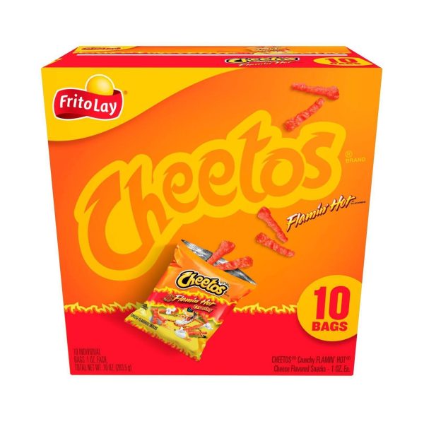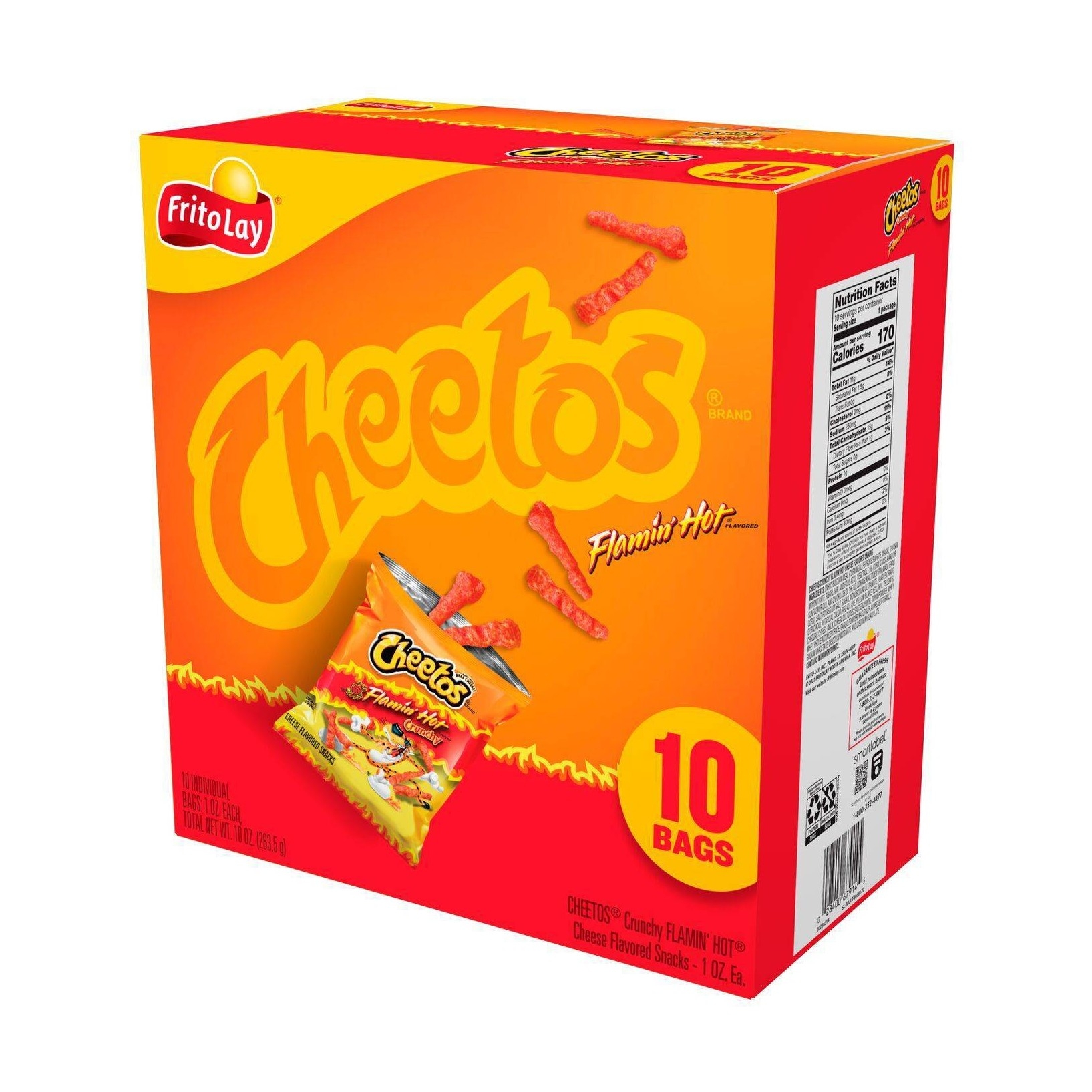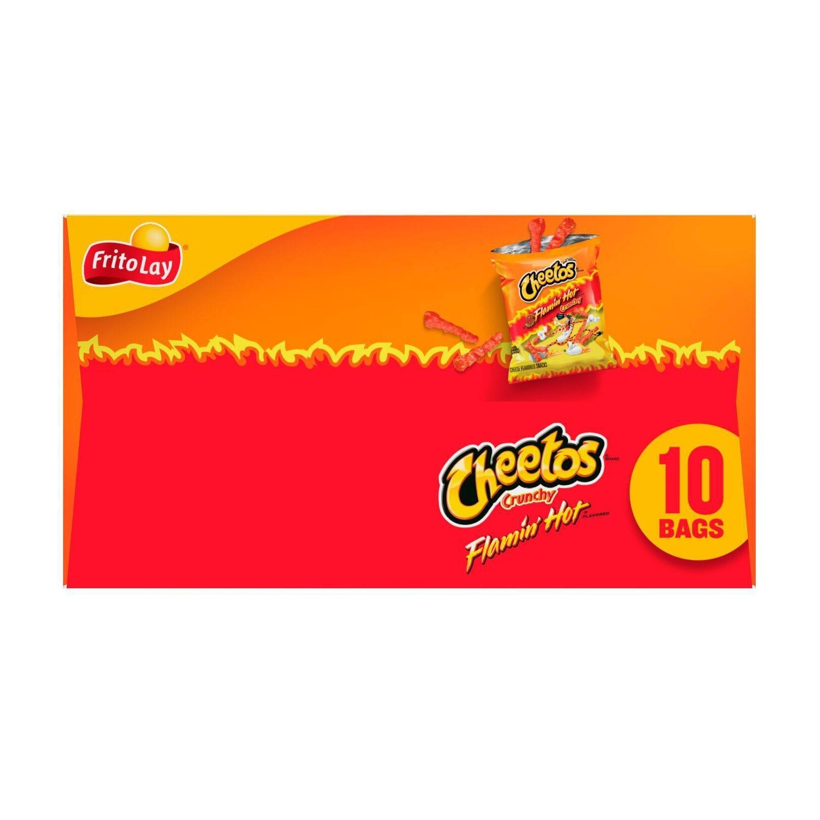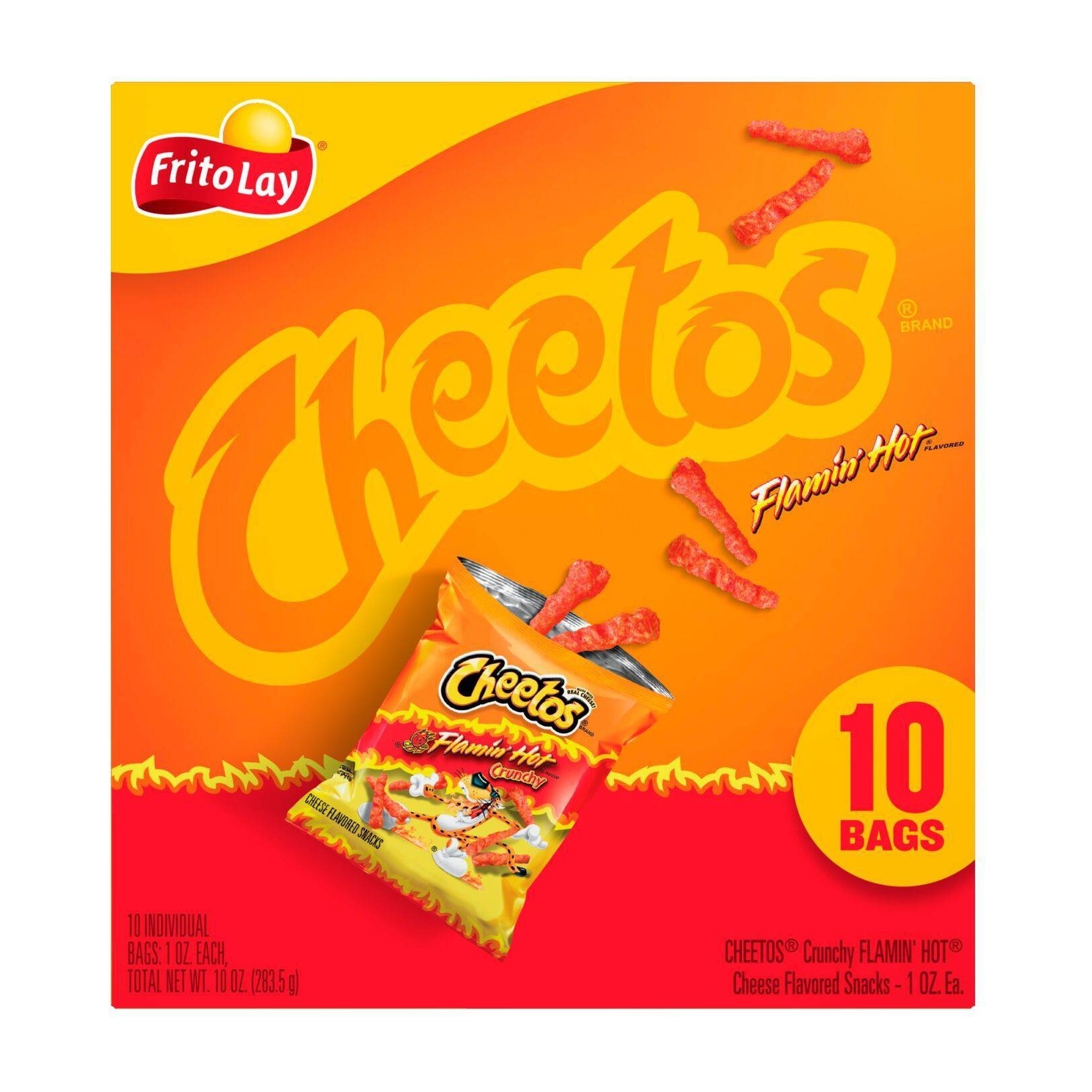 u0026bull;Includes 10 (1oz) bags of Cheetos Flamin’ Hot Crunchy Cheddar Cheese Snacksu003cbru003eu0026bull;Hot, spicy flavor packed into crunchy, irresistible cheese snacksu003cbru003eu0026bull;Made with real cheeseu003cbru003eu0026bull;They’re finger lickin’ good- add some cheesy smiles to your next snacktimeu003cbru003eu0026bull;Perfect to pack for your next work or school lunch- just the right size for fun to the max!u003cbru003eu0026bull;Packaging may vary